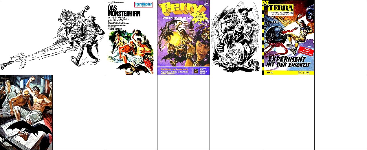 1 - 2, 3 - 9 gleiches Bild, Neuzeichnungen für Neuauflagen, 5 - 6 Ausschnitte, 10 Nachzeichnung für japanische Ausgabe, ein ähnlicher Mann wie der rechte Raumfahrer kommt auch in 11 und 12 vor und ist von 16 nachgezeichnet, vor allem der Gesichtsausdruck, die Körperhaltung des linken Raumfahrers ist vom Mann in 15 nachgezeichnet |