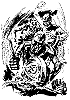 Bild 1 komplett schwarzweiß von 6 nachgezeichnet, 2 - 3 teilweise, der Ceratosaurus mit den nashornähnlichen Höckern auf dem Schädel findet sich auch in 4 und seitenverkehrt in 5 wieder |