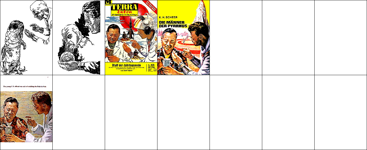 ähnliches Motiv, 2 - 6 Neuzeichnung von 1 für Neuauflage, 7/8 für HC-Ausgabe, 9 für Leihbuchausgabe, 10 -12 gleiches Bild, 5 und 12 seitenverkehrt, 15 Vorbild für Nachzeichnungen |