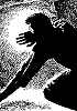 Mann mit gespreizten Beinen, durch die man am Boden kauernden Mann bzw. eine Männergruppe bzw. Bestie sieht, siehe auch