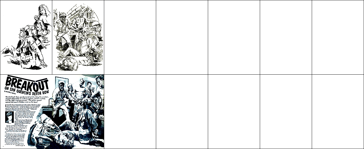 1 - 5 gleiches Bild, 5 seitenverkehrt, in 6 und 7 ist der gleiche gefesselt kauernde Mann, den man in 1 durch die Beine sieht, 8 Vorbild für die Nachzeichnung der ganzen Szene in 1 - 7 |