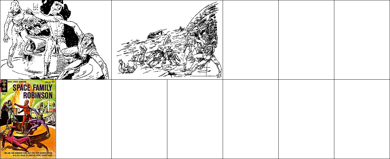 1 - 8 gleiches Bild, der liegende Raumfahrer mit rotem Anzug in 10 ist sehr ähnlich, hat aber einen Arm ausgestreckt, das Artefakt in 1 ist von 15 nachgezeichnet (man bachte auch den Bildhintergrund), 16 - 18 gleiches Bild, 18 seitenverkehrt, Vorbild für die Nachzeichnungen des Raumfahrers mit rotem Anzug |