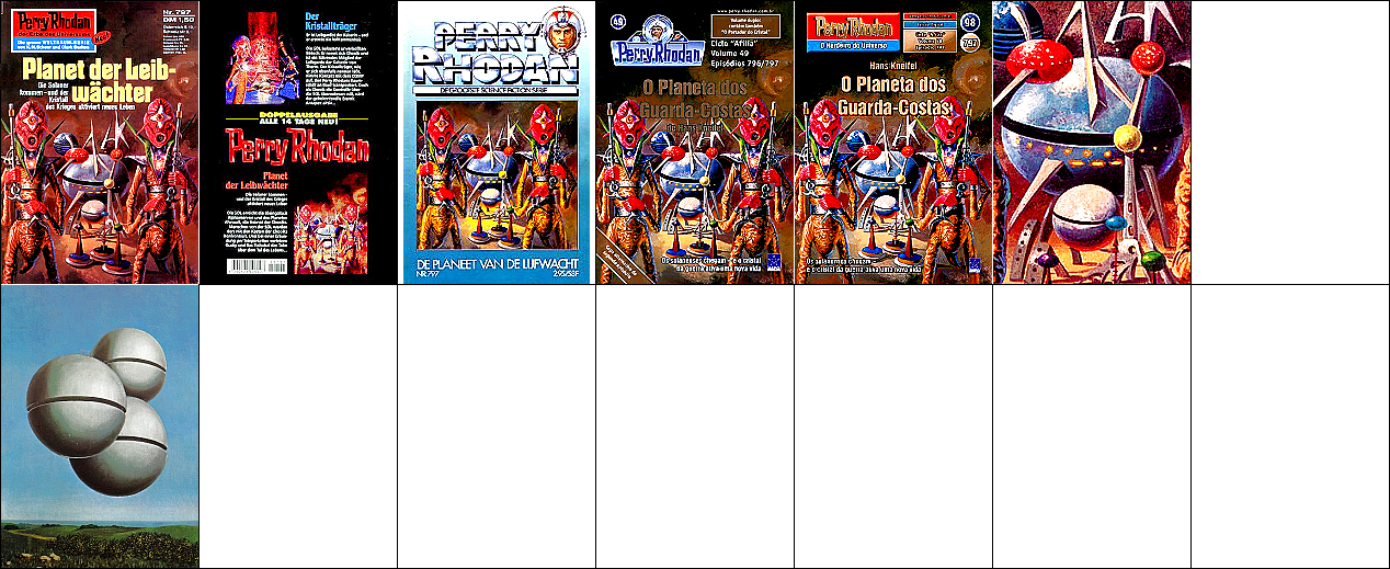 Diskusraumschiff sehr ähnlich, 1 - 5, 6 - 10, 15 - 16 gleiches Bild. Das Titelbild von Bruck in 6 ist mit der Version von Turner in 15 bis auf die höheren Zentralberge im Mondkrater vollkommen identisch, fast nicht auszumachendes Plagiat! |