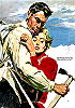 Menschenpaar schaut zu Außerirdischem mit Vogelkopf |