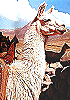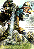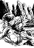fliegende Frauengestalt über Szenerie mit 2 Kämpfern und fuchsartigen Außerirdischen |