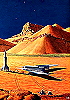 Wüstenlandschaft mit Bergkette und gelandetem Raketenraumschiff in der Ebene |