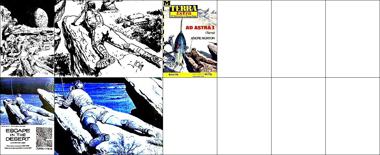 gleiche Körperhaltung, 2 seitenverkehrt, restliches Bild unterschiedlich, von 8 nachgezeichnet, das Motiv von 8 wurde vom Zeichner auch in 4 verwendet, 5 ist davon nachgezeichnet bzw. sogar teilweise einmontiert, der Kopf des Mannes taucht auch in 6 auf |