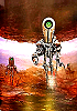 Roboter mit Stelzenbeinen und einem großen Auge im kleinen Kopf |