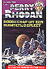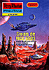 Raumfahrer und eiförmige Bombe vor Felssäulen, am Himmel radförmige Raumstation |