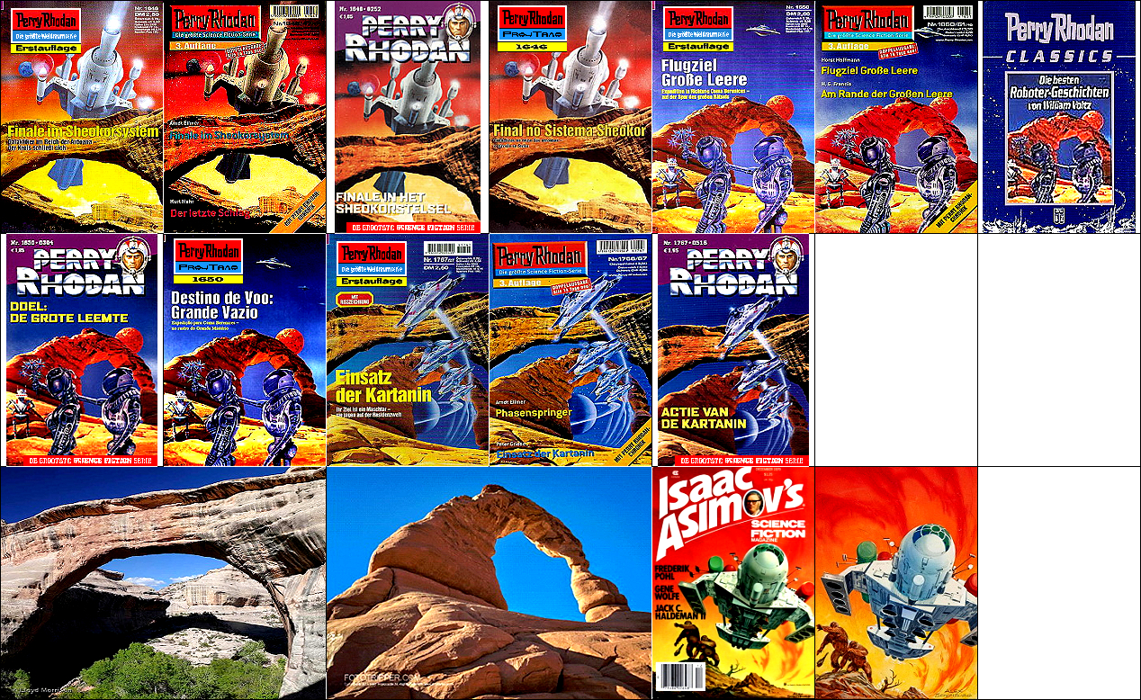 ähnliche Motive, 1 - 4, 5 - 9, 10 - 12 gleiches Bild, in 10 kommen beide Bögen aus 1 und 5 vor, 15 ist die Collagevorlage für den Bogen in 1 und den vorderen Bogen in 10, 16 ist das Vorbild für den Bogen in 5 und den hinteren in 10, das Raumschiff in 1 ist von 17 bzw. 18 nachgezeichnet |