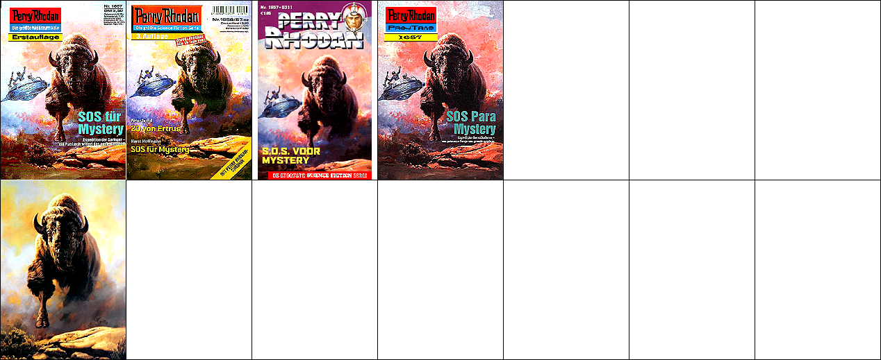 1 - 4 gleiches Bild, der Hintergrund ist umgedreht komplett auch für 5 verwendet, 5 - 7 gleiches Bild. Die Grafik, welche auch als Titelbild für 8 verwendet wurde, ist die Vorlage, die für 1 und 5 mit einem Raumfahrer bzw. mit Raumbooten ergänzt wurde (8 ist später als die beiden PR-Hefte erschienen). |