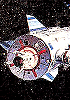 Raketenraumschiff zwischen Mond mit Kuppelstationen und Asteroiden, siehe auch
