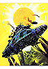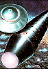 bleistiftförmiges Raumschiff über vulkanischer Landschaft, siehe auch