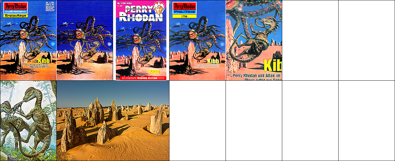 1 - 5 gleiches Bild, die Bildkomposition ist eindeutige von 8 bzw. 9 nachgezeichnet, aber das Raumschiff verändert, das Raumschiff in 6 ist ein eindeutiger Clon von 8 |