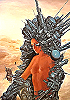 riesiger ballartiger Außerirdischer mit Rüssel und vier Armen, davor Diskusraumboot und Tyrannosaurus, davor Diskusraumboot und Tyrannosaurus, siehe auch