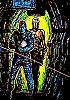 Außerirdischer im Raumanzug, aus dessen kleiner Sichtöffnung Strahl weggeht |