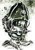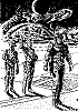 Schemenhafte roboterartige Figur mit gespreizten Beinen, darunter Explosion |