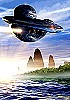 Kugelraumschiff mit blütenartigen Verzierungen und einem Flammenstrahl, der vom oberen Pol emporschießt
