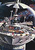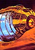 Obelisk, Raumschiff und dahinter Riesenplanet am Himmel