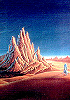 Raumschiff in Wüstenlandschaft vor spitzem Berg