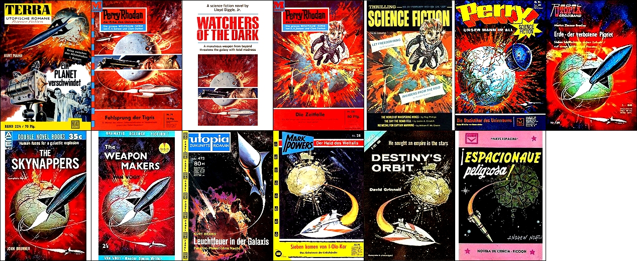 1 - 2 gleiches Bild, Figuren überarbeitet, 3 - 5 gleiche Perspektive. Vorbild für Nachzeichnung ist 6 bzw. 7, in 8 taucht das Motiv nochmals als Zweiergruppe auf, das Raumschiff in 9 dürfte als Inspiration für das Gerät in 1 gedient haben (man beachte die Farbkombination) |