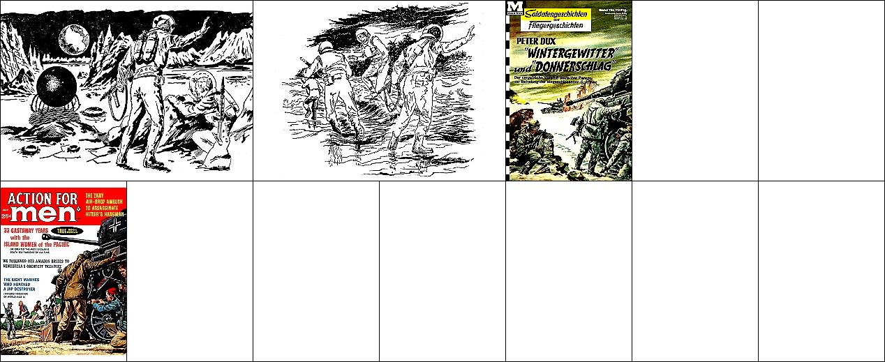 1 - 2, 3 - 10 gleiches Bild, Neuzeichnung für Neuauflagen mit verändertem liegenden Mann, 11 - 12 gleiches Bild in Farbe und s/w, Neuinterpretation für Comicausgabe, der Mann in 13 hat die gleiche Körperhaltung wie der Mann im Hintergrund von 1, 15 bzw. 16 Vorlage für 13 und den Mann im Hintergrund von 1, 17 ist die Vorlage für den Polizisten in 1 (man beachte die abgespreizten Finger der rechten Hand), der Mann kommt als Ausschnitt auch in 18 vor |
