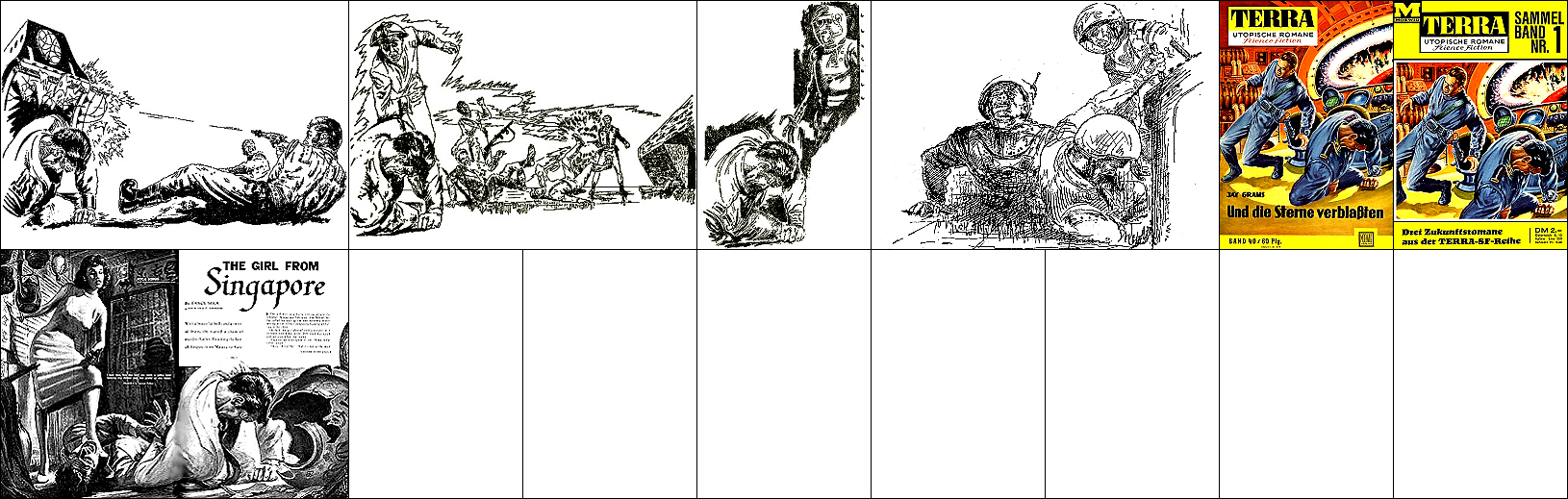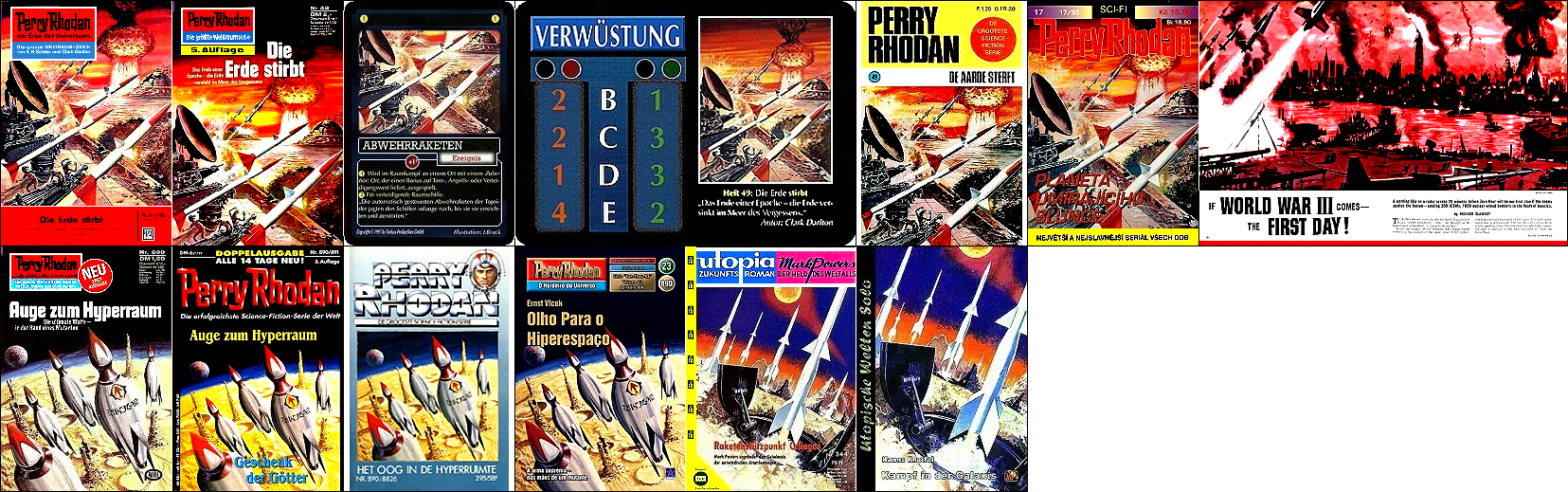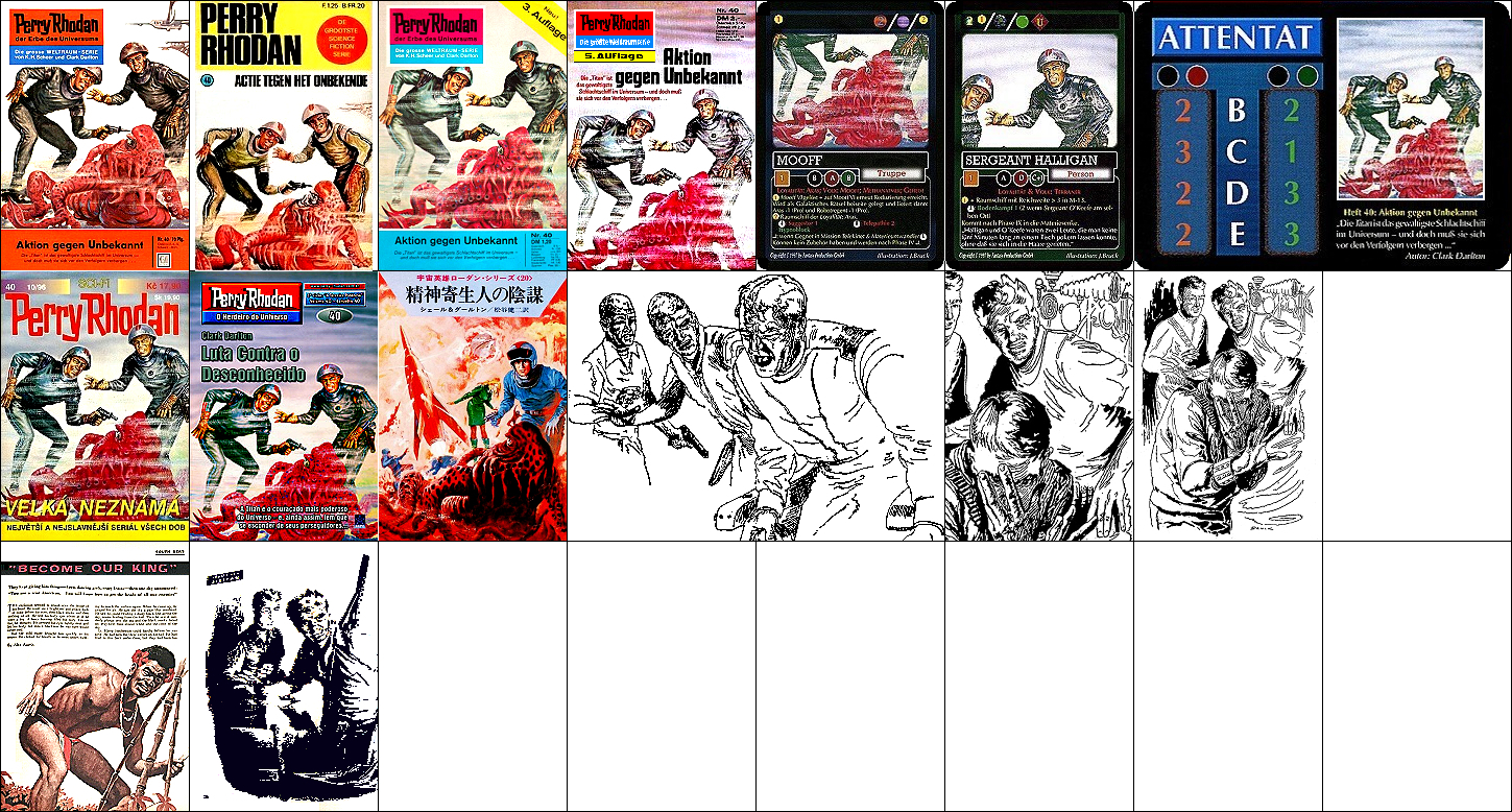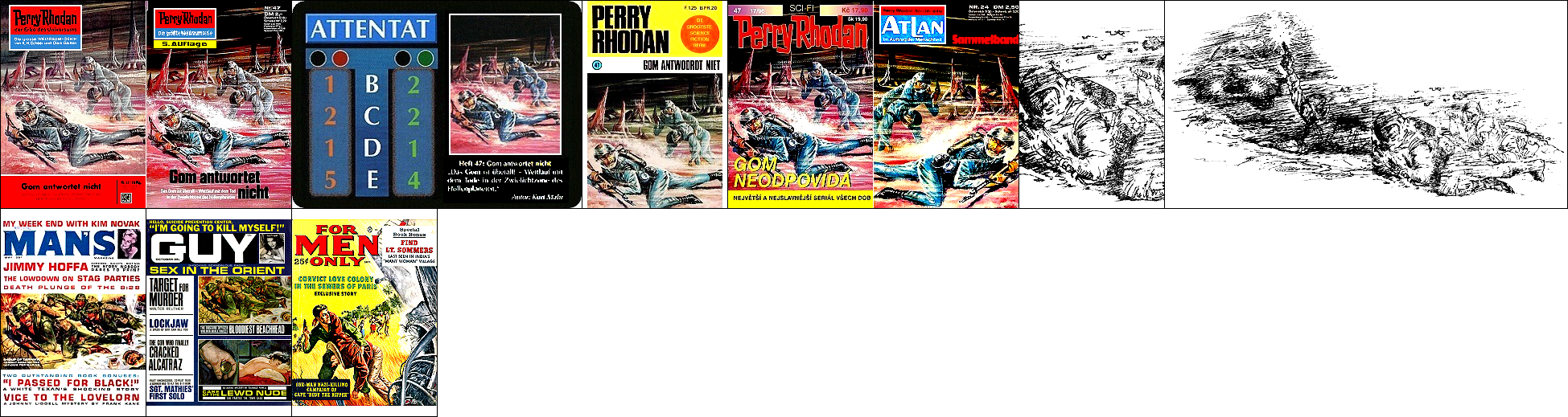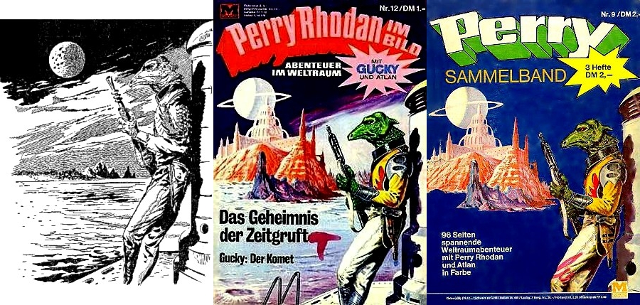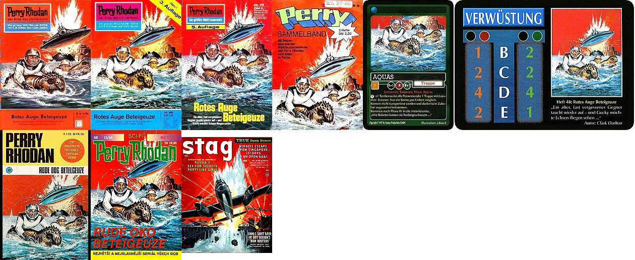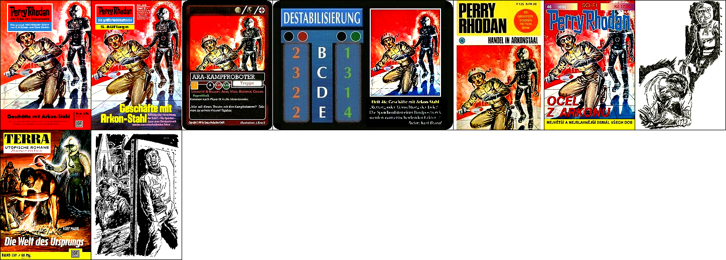1 - 2, 3 - 9 gleiches Bild, Neuzeichnungen für Neuauflagen, 5 - 6 Ausschnitte, 10 Nachzeichnung für japanische Ausgabe, ein ähnlicher Mann wie der rechte Raumfahrer kommt auch in 11 und 12 vor und ist von 16 nachgezeichnet, vor allem der Gesichtsausdruck, die Körperhaltung des linken Raumfahrers ist vom Mann in 15 nachgezeichnet |