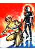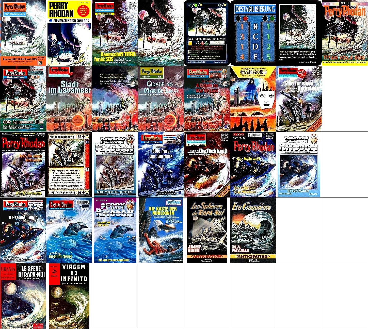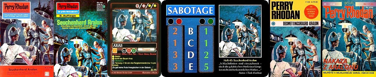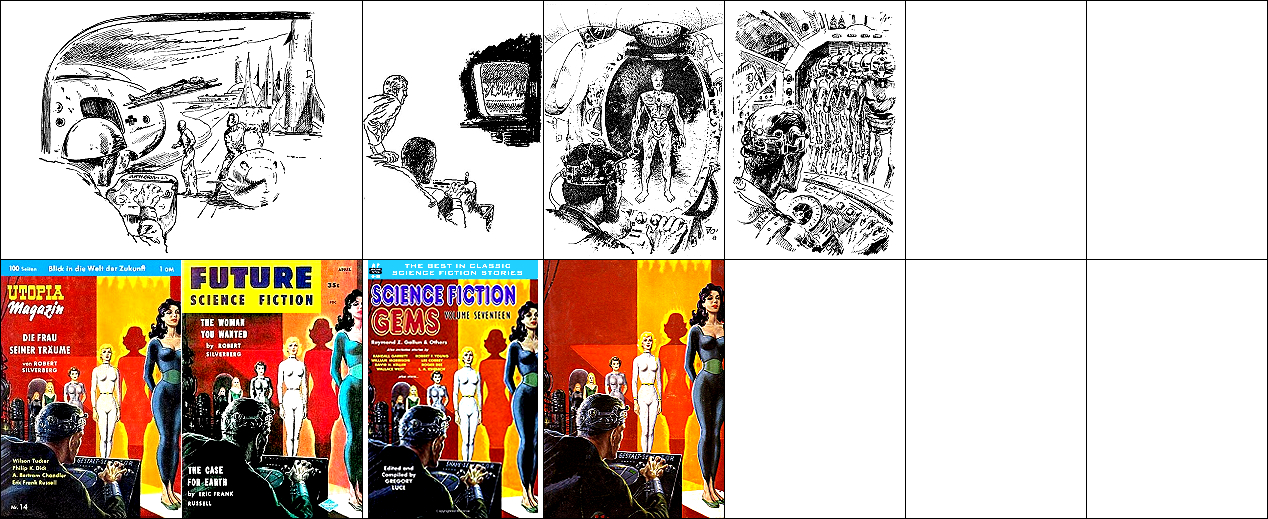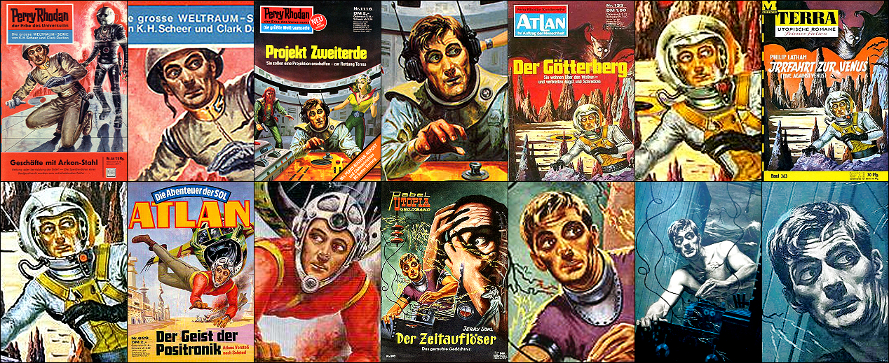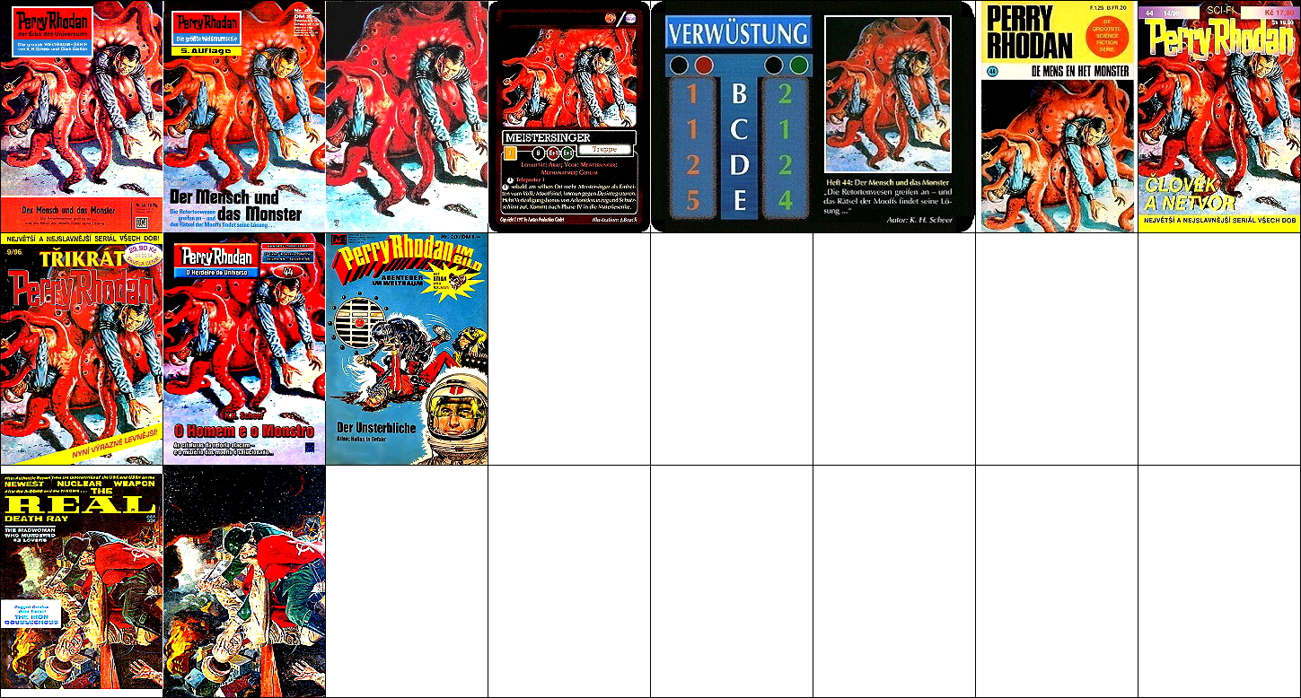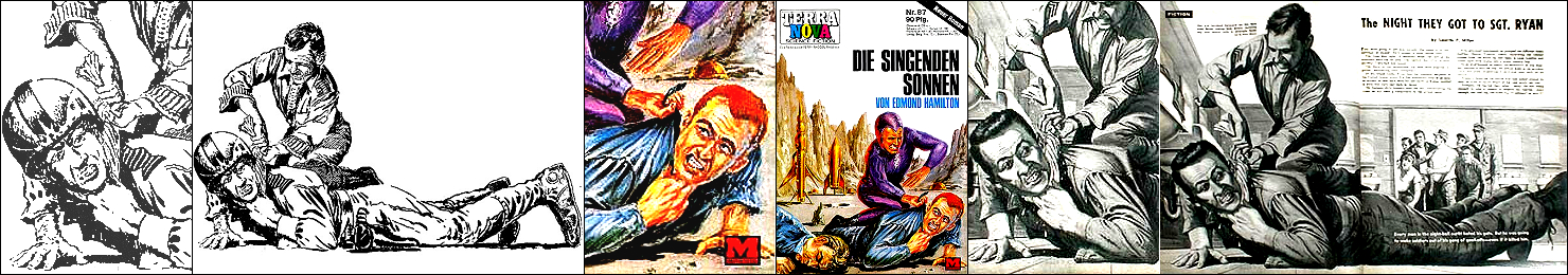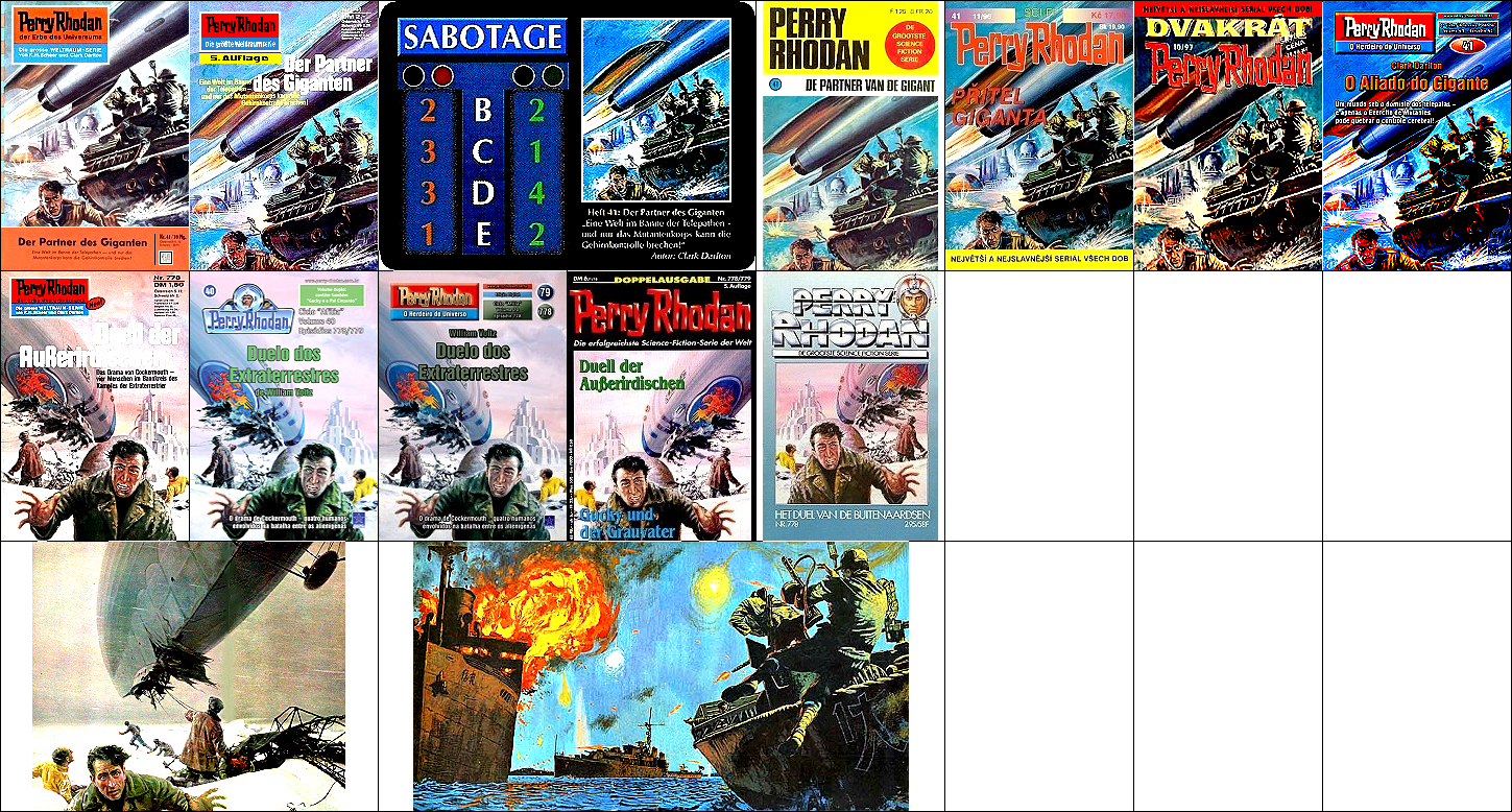 1 - 2, 3 - 9 gleiches Bild, Neuzeichnungen für Neuauflagen, 5 - 6 Ausschnitte, 10 Nachzeichnung für japanische Ausgabe, ein ähnlicher Mann wie der rechte Raumfahrer kommt auch in 11 und 12 vor und ist von 16 nachgezeichnet, vor allem der Gesichtsausdruck, die Körperhaltung des linken Raumfahrers ist vom Mann in 15 nachgezeichnet |