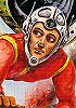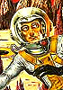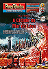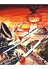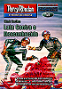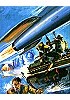 nach vorn blickender Mann mit düsterem Gesichtsausdruck und wehendem Haar, dahinter Panzer mit Besatzung und darüber Rakete im Tiefflug |