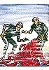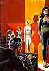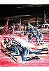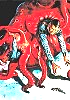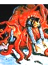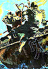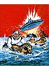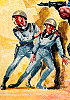 Raumsoldaten reiten im Wasser auf Meereslebewesen, dahinter Raumjäger und aufspritzendes Wasser vor rotem Himmel, - siehe auch