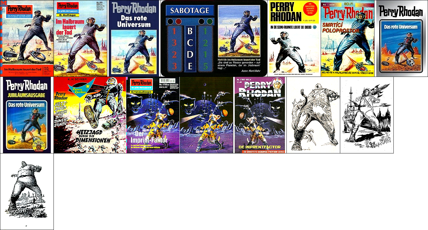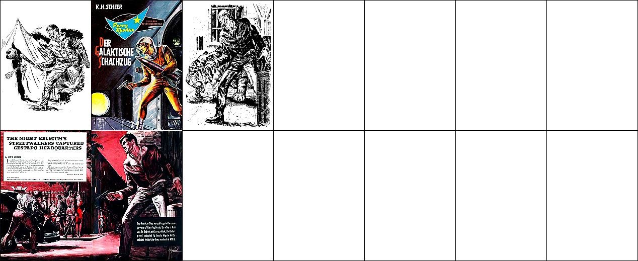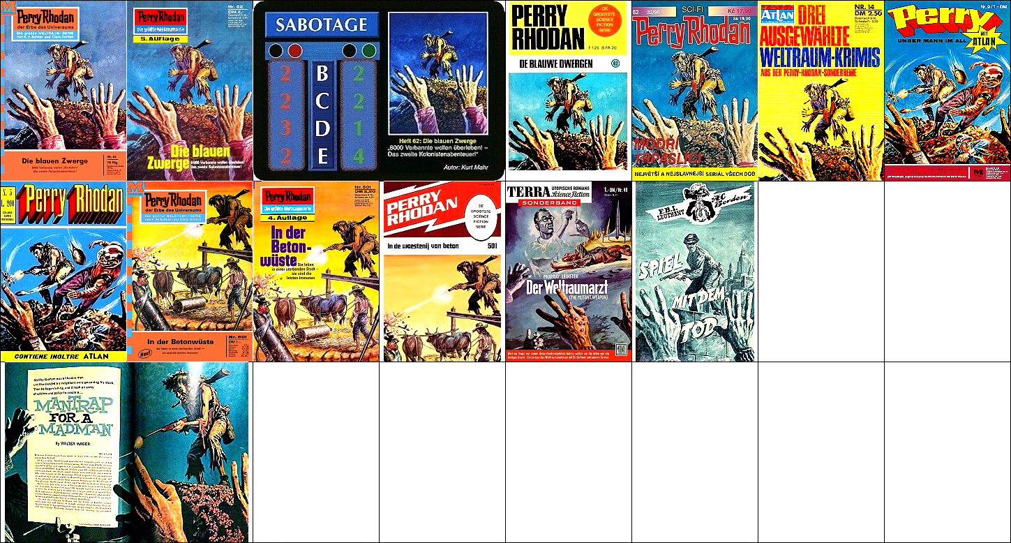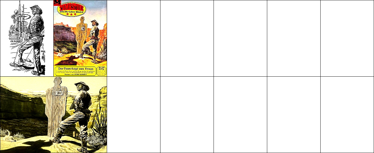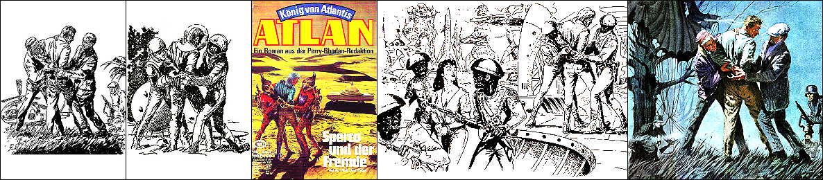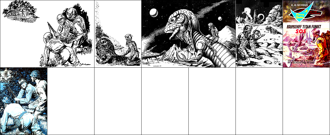 ähnliches Motiv, 2 - 6 Neuzeichnung von 1 für Neuauflage, 7/8 für HC-Ausgabe, 9 für Leihbuchausgabe, 10 -12 gleiches Bild, 5 und 12 seitenverkehrt, 15 Vorbild für Nachzeichnungen |