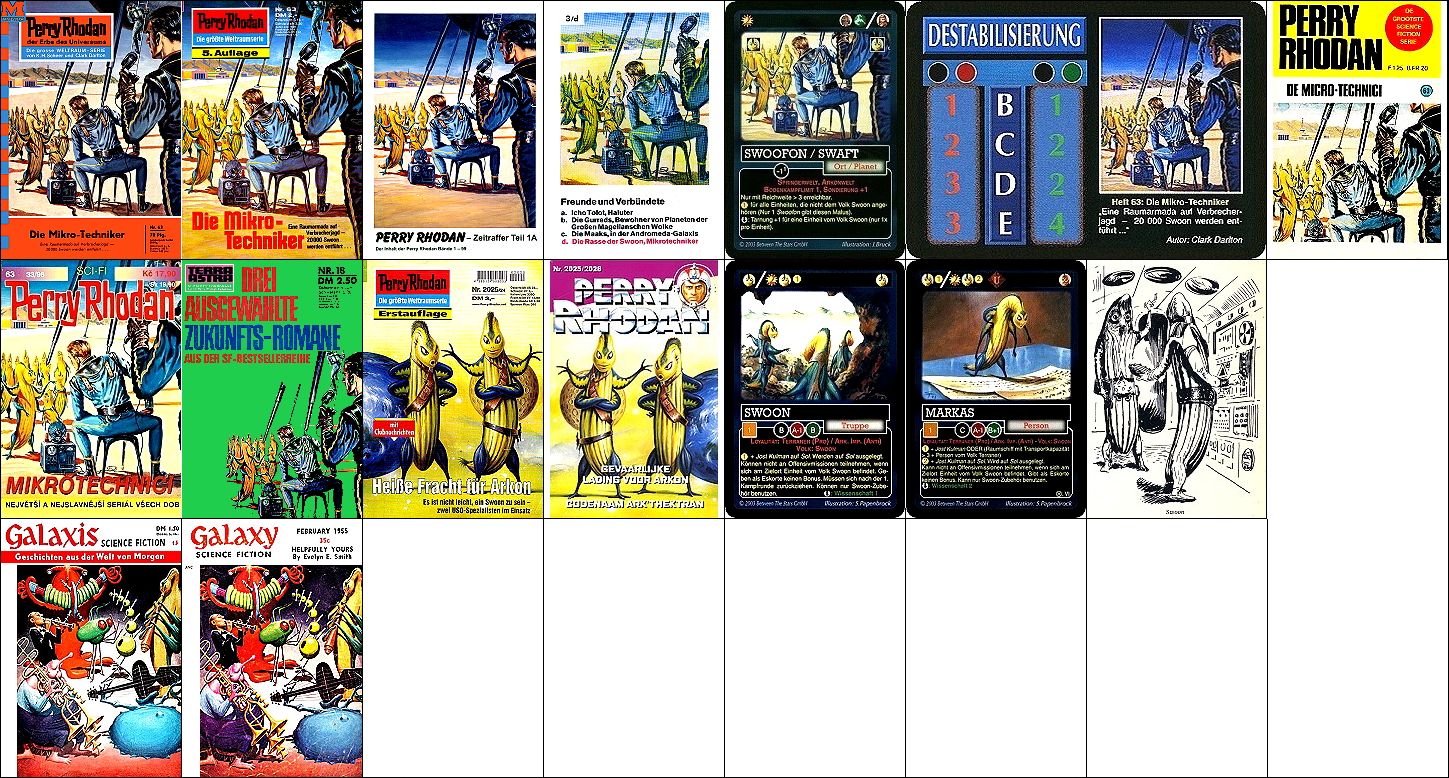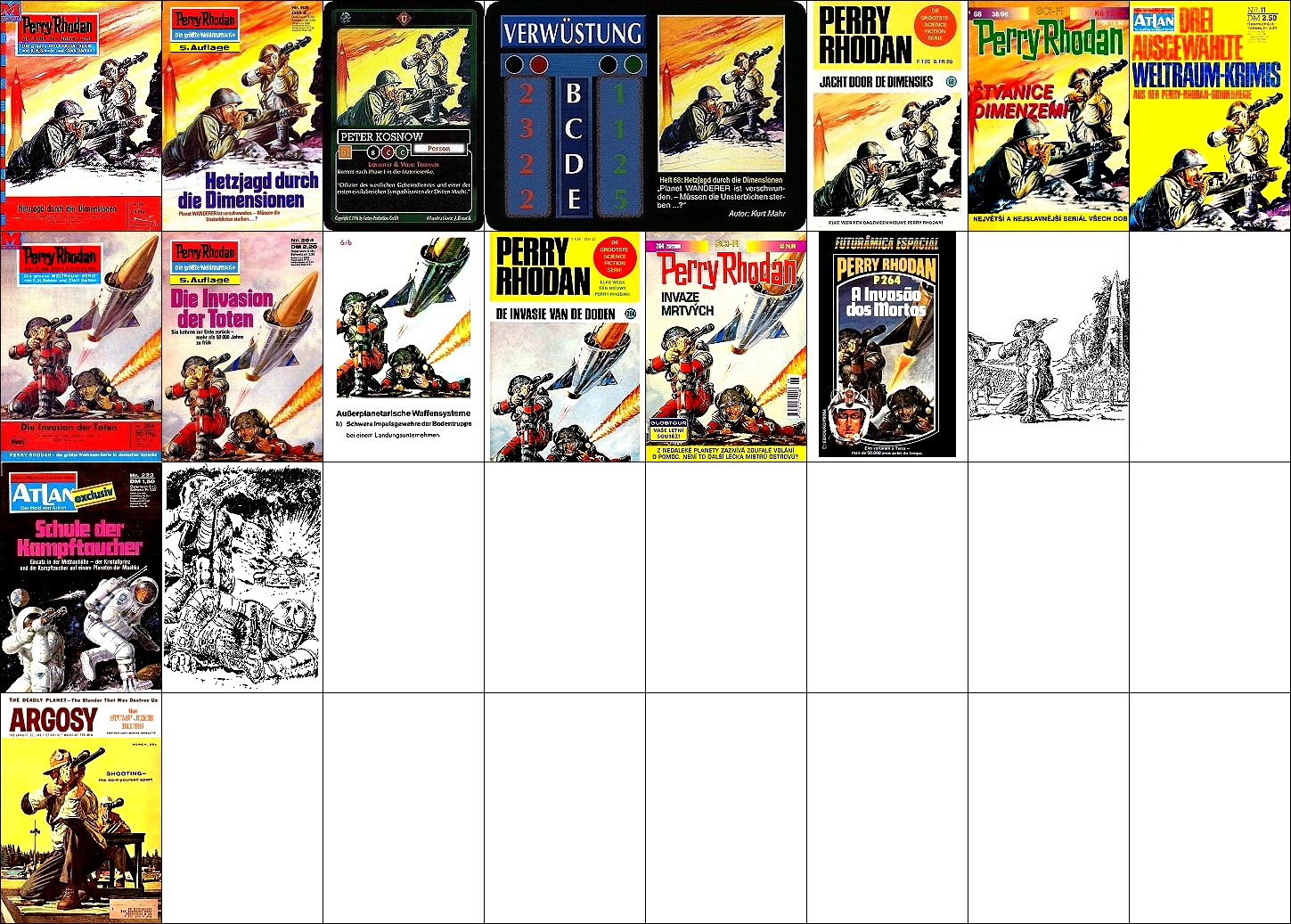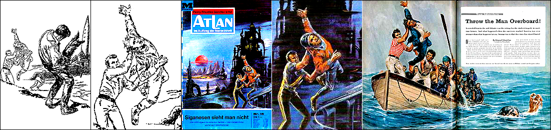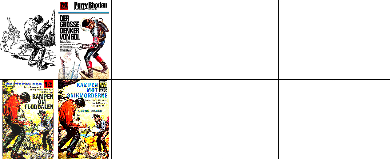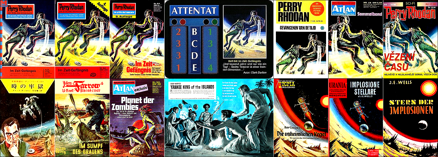 ähnliches Motiv, 2 - 6 Neuzeichnung von 1 für Neuauflage, 7/8 für HC-Ausgabe, 9 für Leihbuchausgabe, 10 -12 gleiches Bild, 5 und 12 seitenverkehrt, 15 Vorbild für Nachzeichnungen |