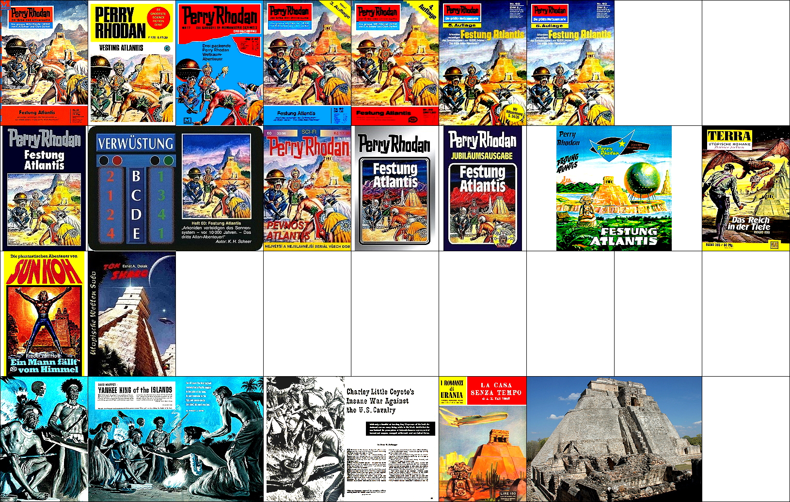 ähnliches Motiv, 1 - 3 gleiches Bild, 3 mit überarbeitetem Hintergrund, 4 - 10 gleiches Bild, Neuzeichnung von 1 für Neuauflage, 11 - 12 gleiches Bild, Neuzeichnung für HC-Ausgabe,13 für Leihbuchausgabe, 14 - 16 mit ähnlicher Pyramide, 22 ist die Vorlage für den sitzenden und den neben ihm stehenden Mann, 23 für den sich bückenden Indianer, 24 könnte die Vorlage für die Nachzeichnung der Pyramide sein und 25 das Vorbild in der realen Welt |