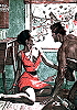 Frau wird durch Roboter/Mann bedroht, der über Leiter herabsteigt |