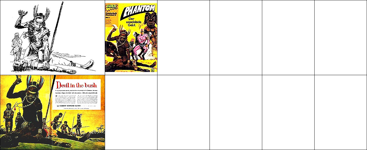 1 - 5 gleiches Bild, 5 seitenverkehrt, 6 gleiches Motiv schwarzweiß, 7 und 8 Nachzeichnungen für japanische Ausgaben, weitere mit geringerer Ähnlichkeit, 15 Vorlage für Nachzeichnungen, ganz besonders für 6 |
