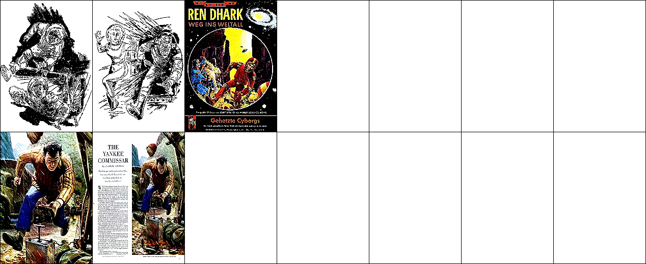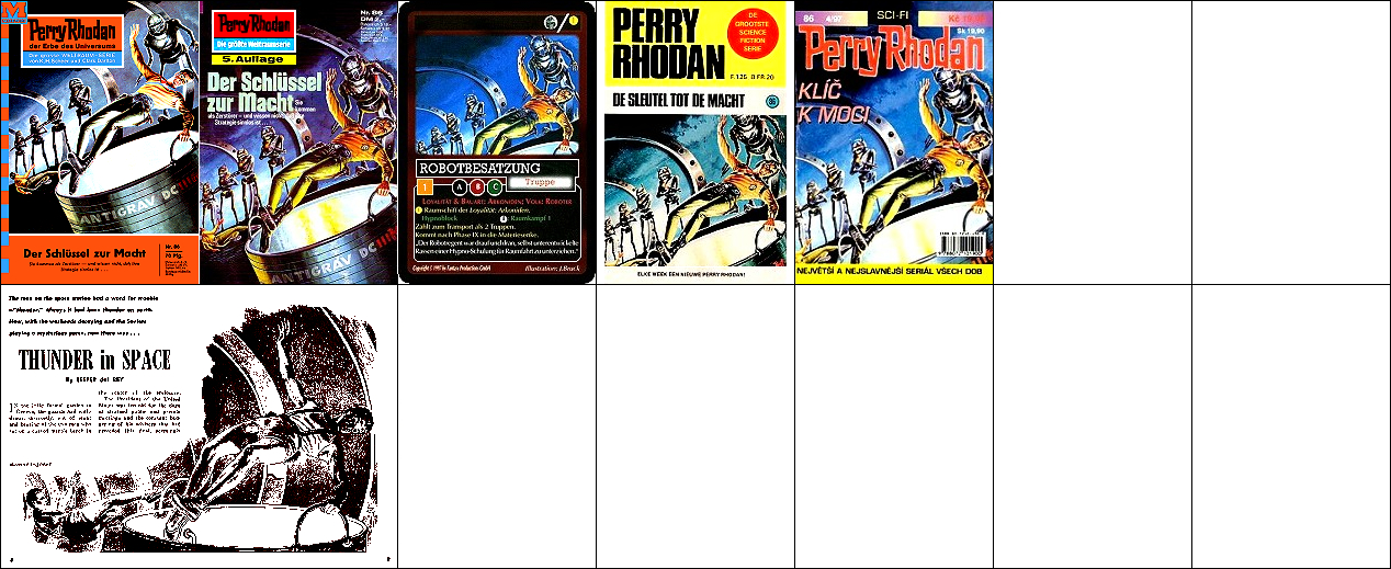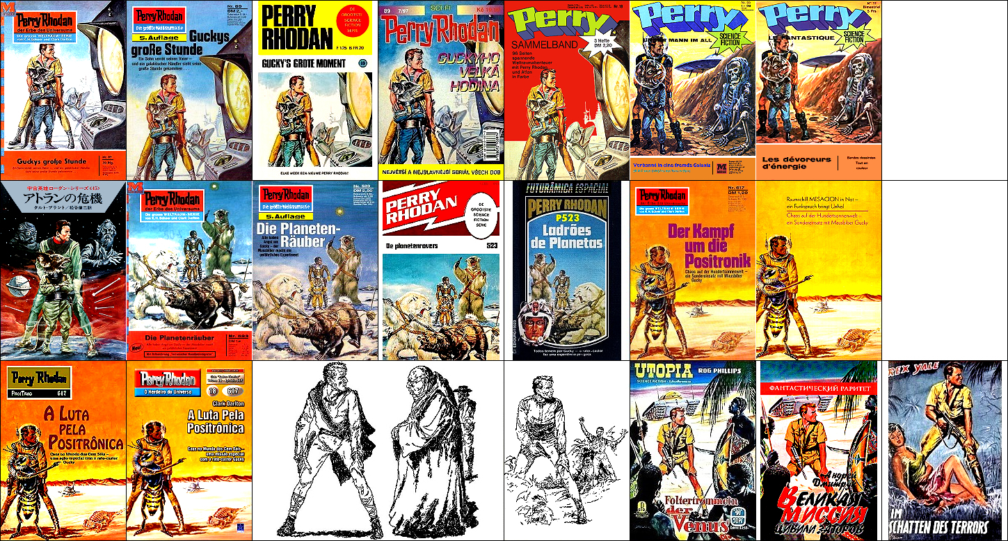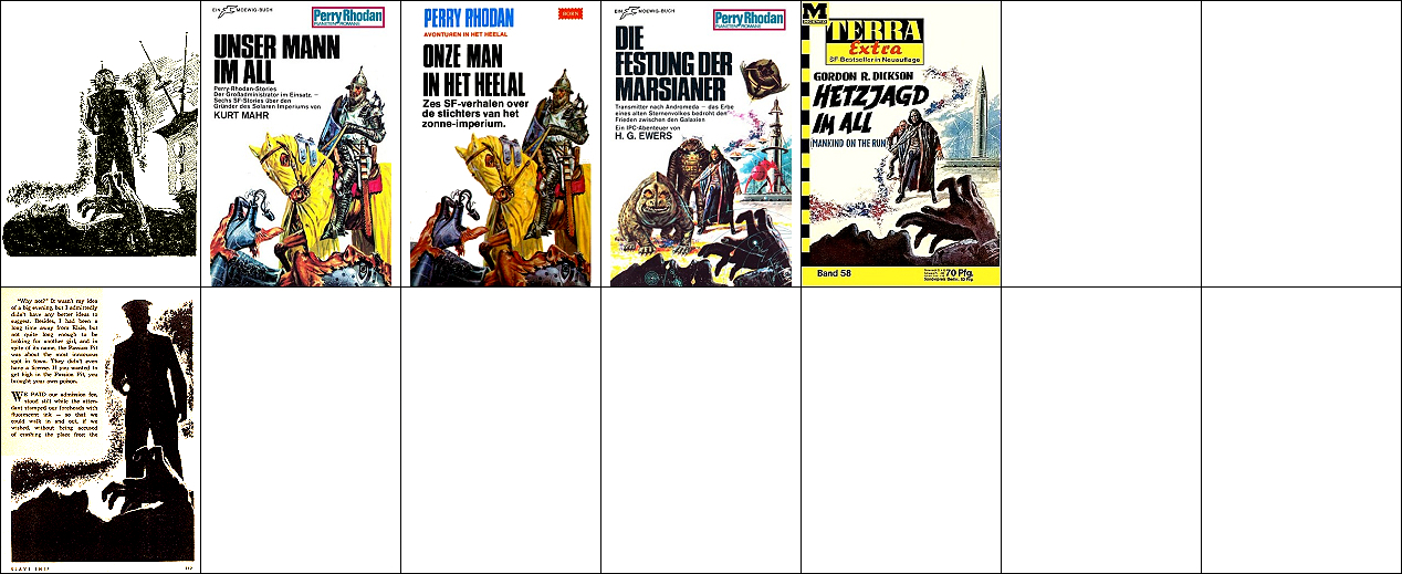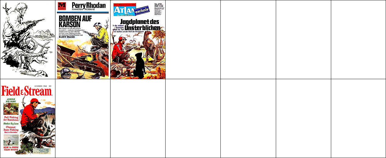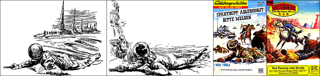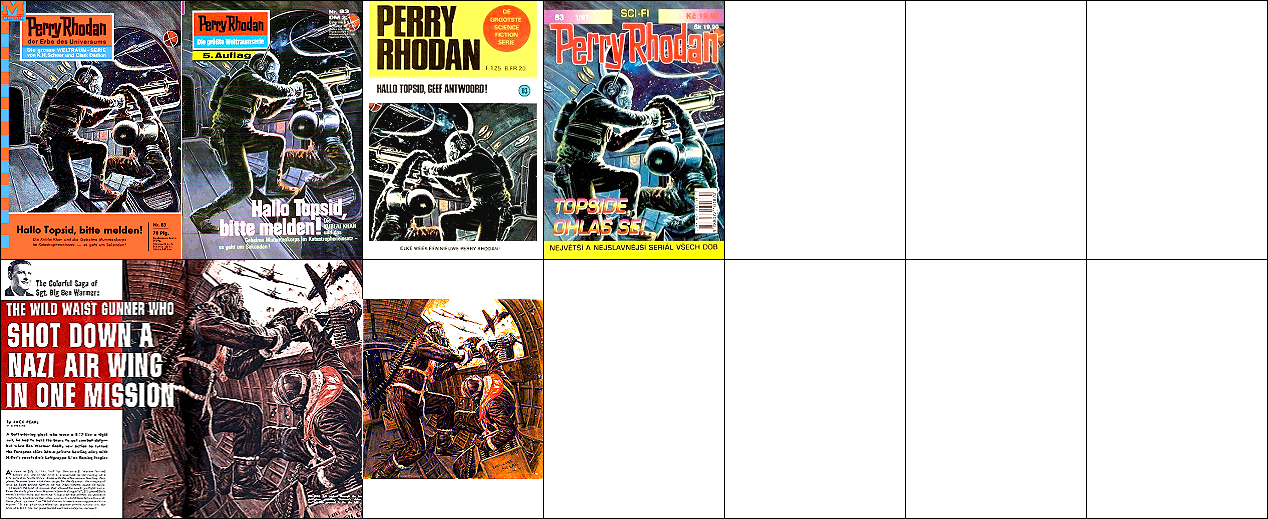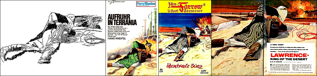 gleiche Körperhaltung, 1 - 5 gleiches Bild, 4 seitenverkehrt, 5 Hintergrund überarbeitet, 6 - 7 gleiches Bild, 8 sehr ähnlich, 9 schemenhafte Darstellung, 15 Vorlage für den Außerirdischen, 16 für den Mann in 1 bzw. für das ganze Motiv der Bilder ab 6 |