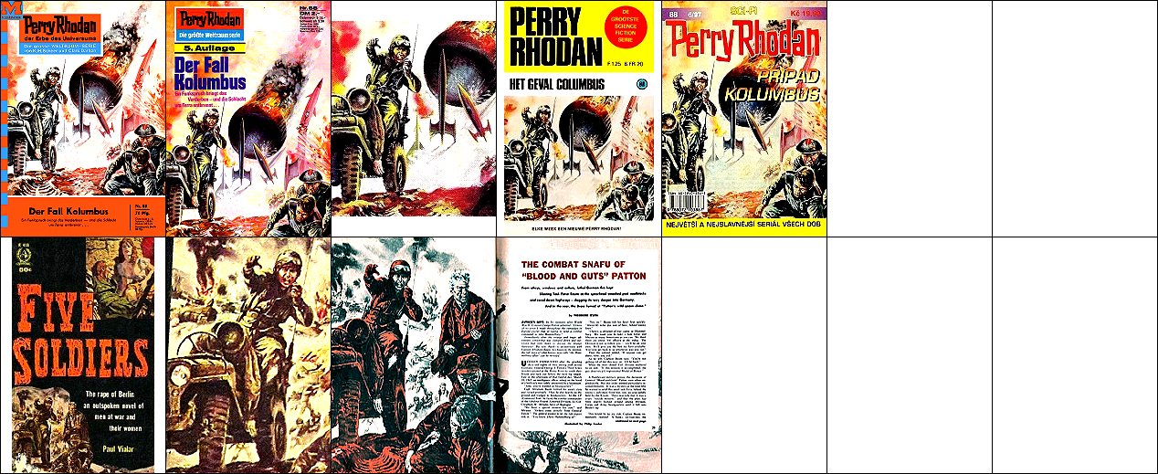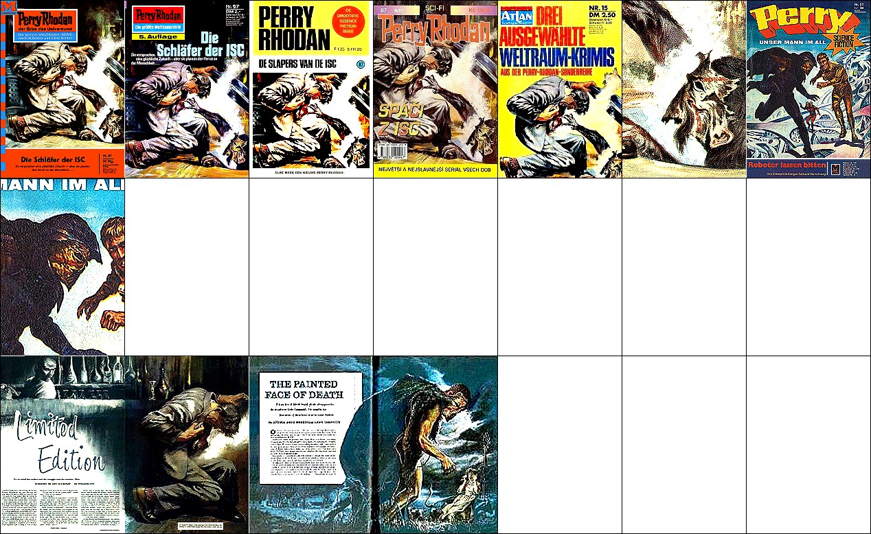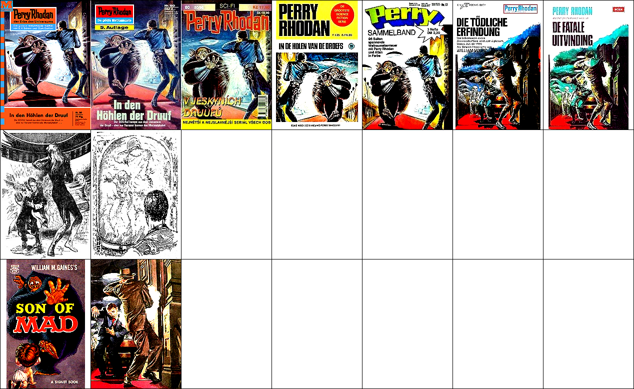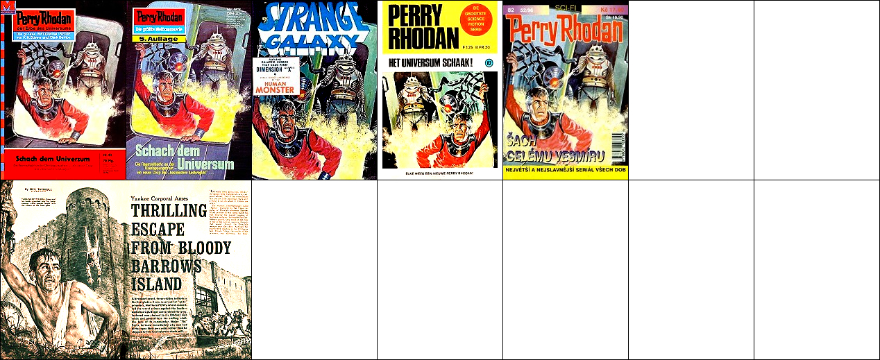 1 - 5 gleiches Bild, 5 Hintergrund überarbeitet, von 8 nachgezeichnet, der Kopf des Außerirdischen rechts ist von 9 nachgezeichnet, ein Mann mit einer ähnlichen Maske kommt auch in 7 vor |