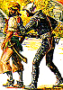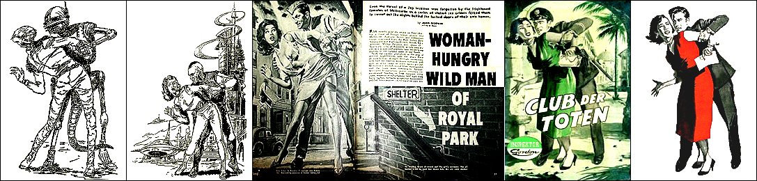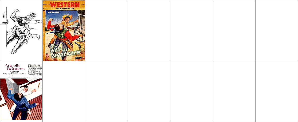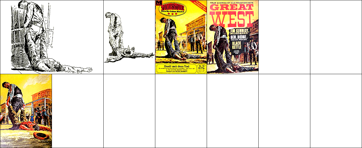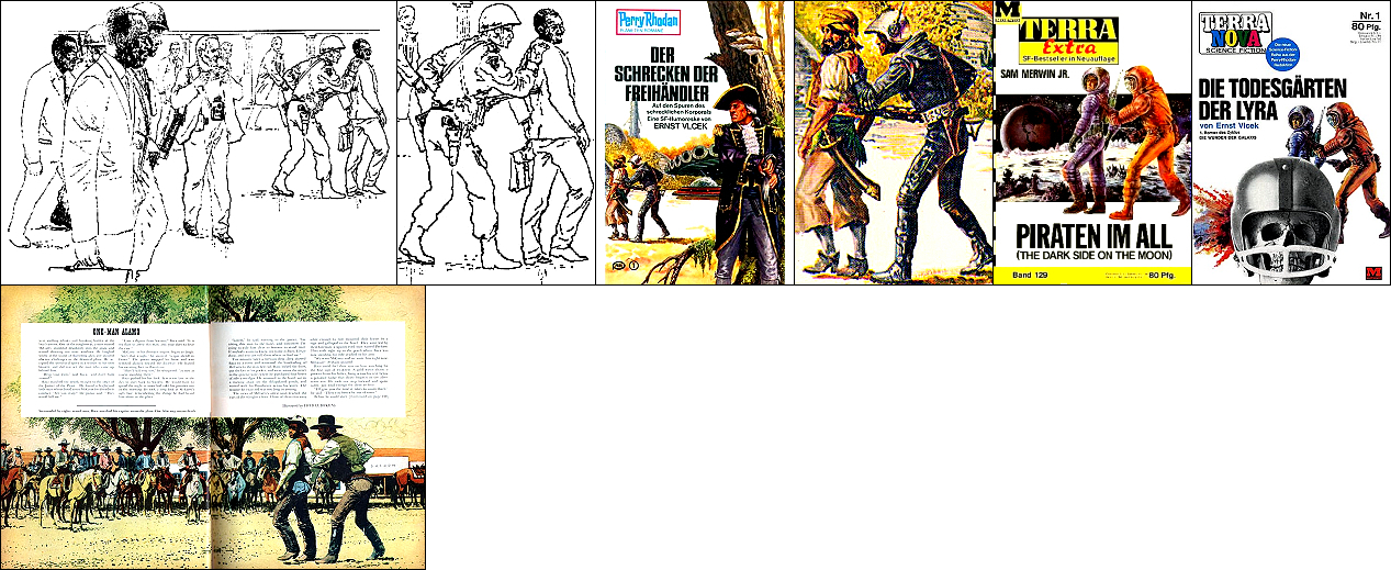 die Szene in 1 findet sich in 3 seitenverkehrt wieder, in 5 sind die beiden Männer ebenfalls vorhanden und in 6 als Collage eingebaut, 8 Vorbild für Nachzeichnungen |