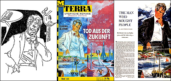 1 - 4 gleiches Bild, 4 seitenverkehrt, 8 - 11 gleiches Bild, Vorbild für den Mann im Bildschirm, 12 könnte als Inspiration für die Szene mit den drei Männern gedient haben |