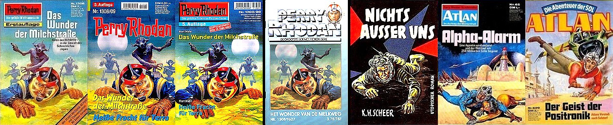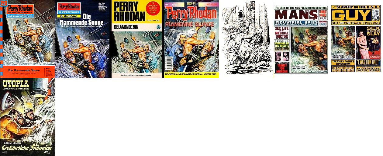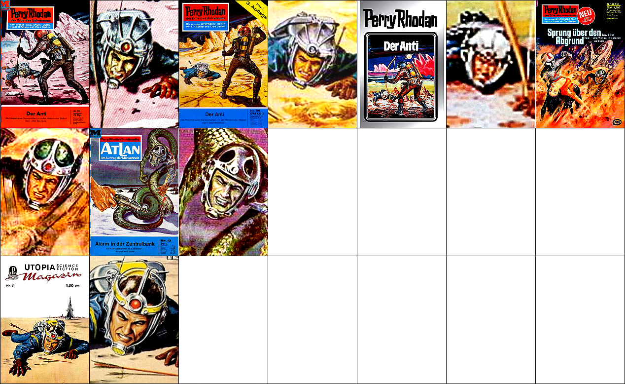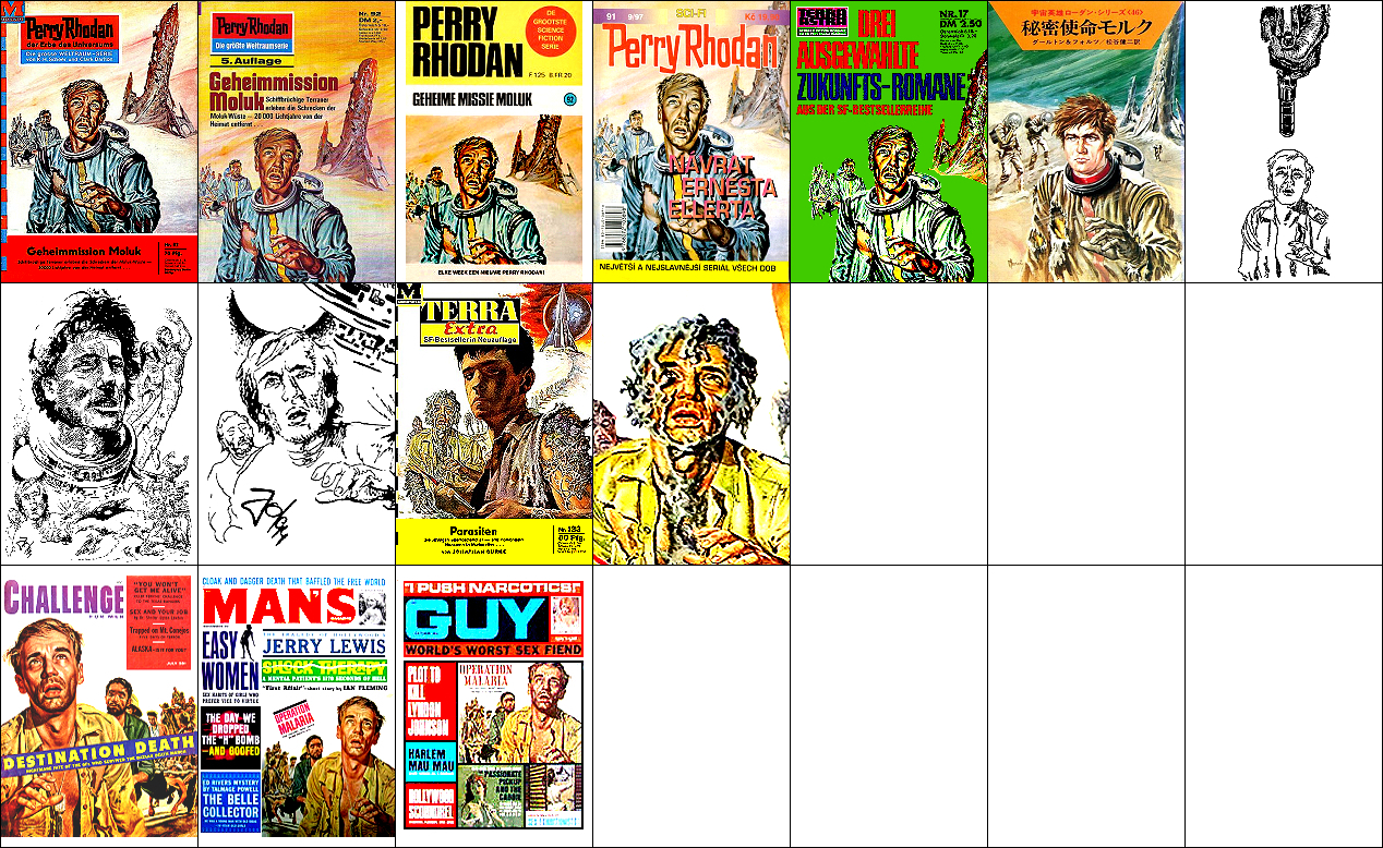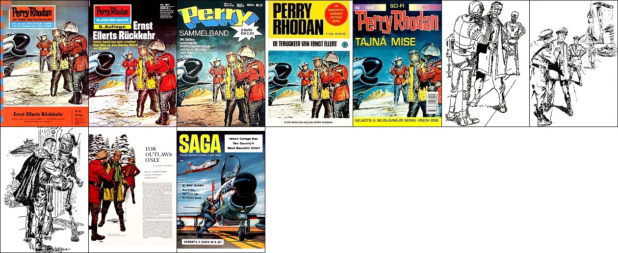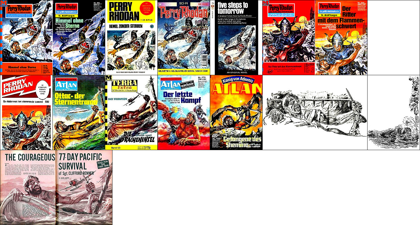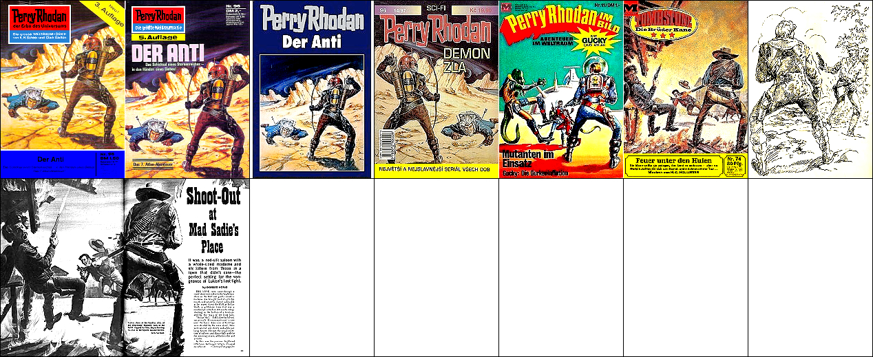 1 und 2 gleiches Bild, 2 seitenverkehrt, 3 Nachzeichnung ohne Gucky, seitenverkehrt, 4 und 5 Nachzeichnung für Neuauflage, weitere mit ähnlicher Körperhaltung von Gucky, 11 möglicheweise Vorbild für die Körperhaltung, speziell in 1 |