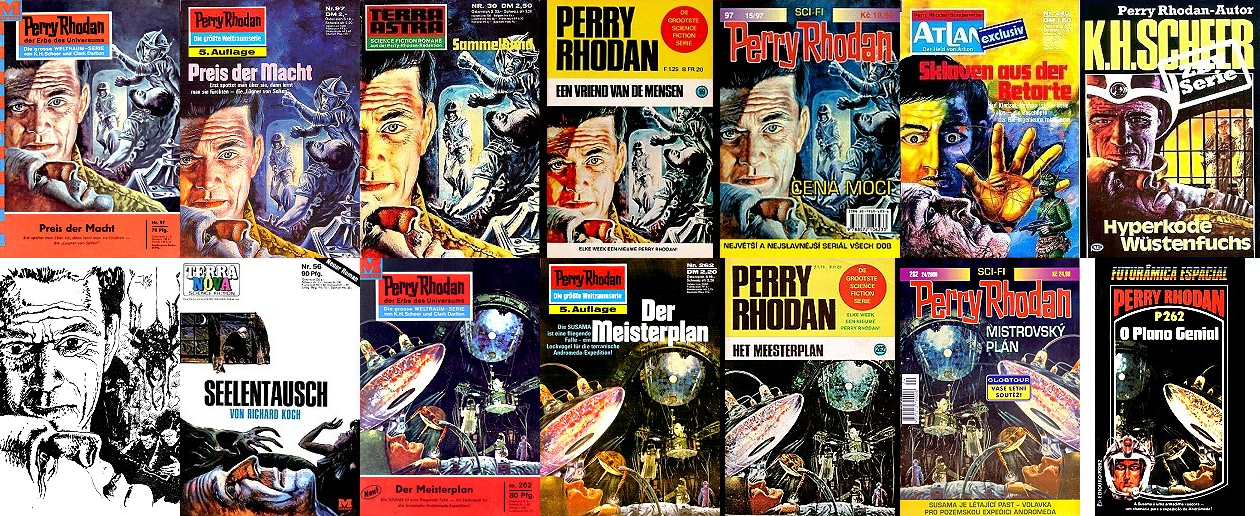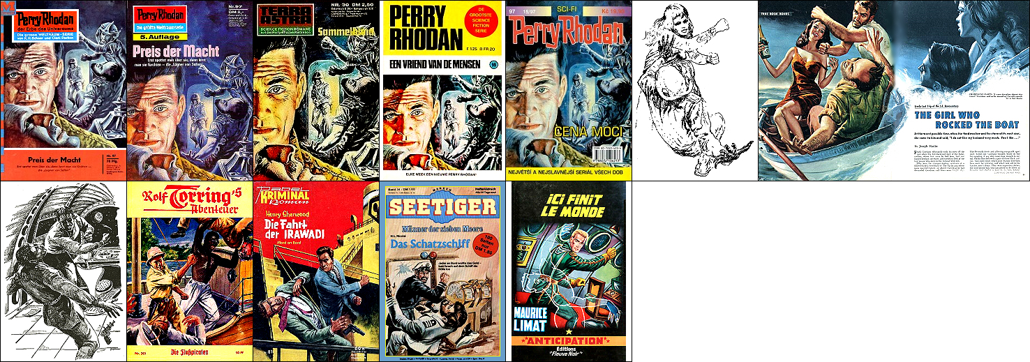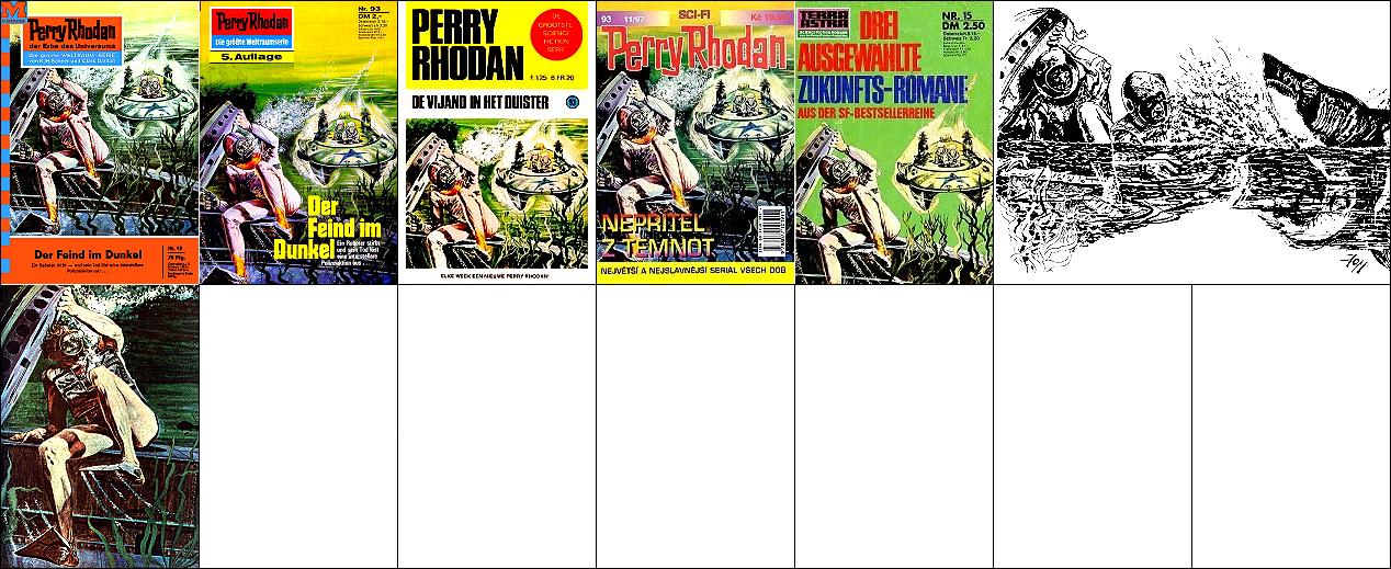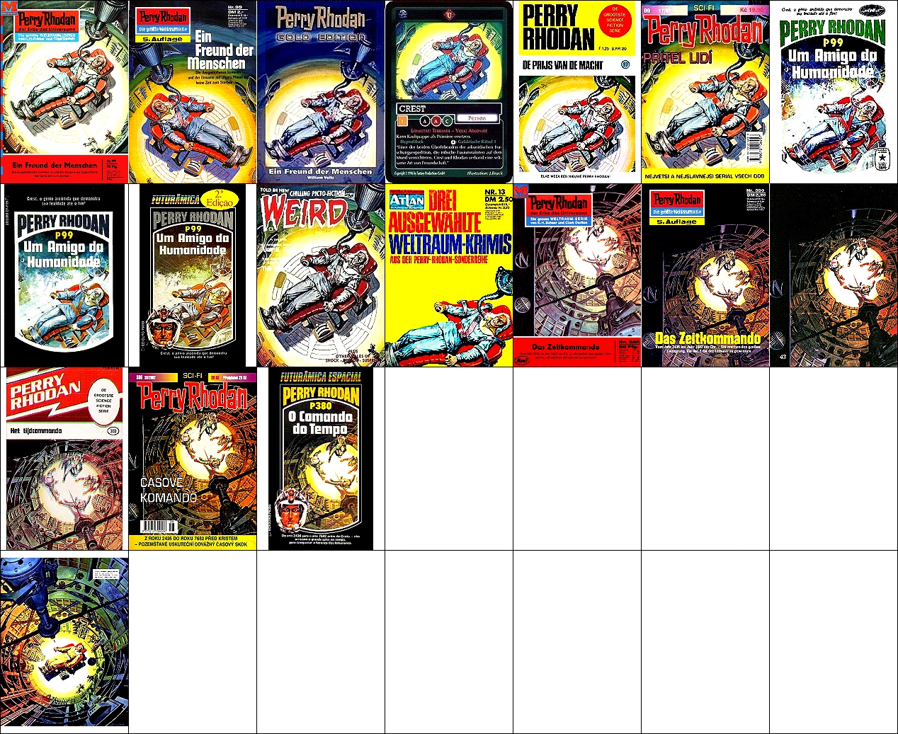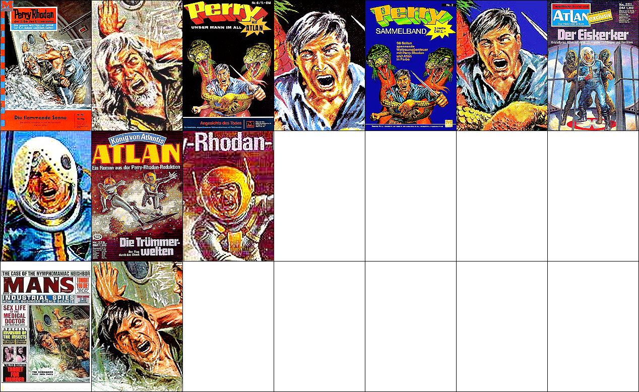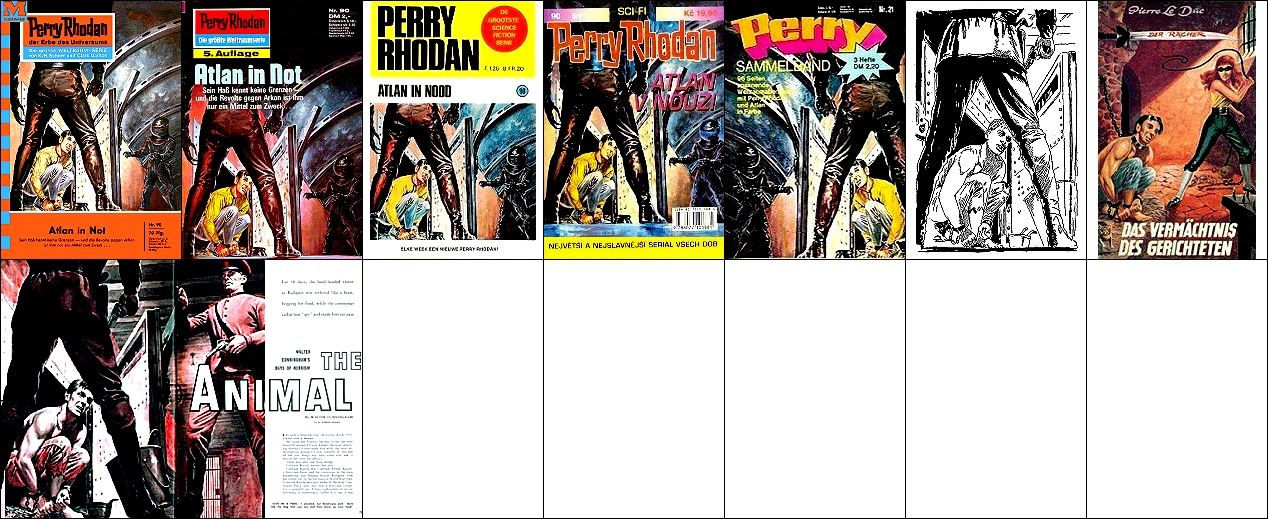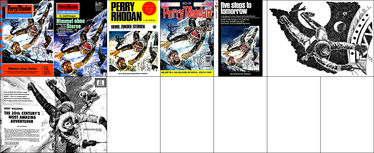 1 und 2 gleiches Bild, 2 seitenverkehrt, 3 Nachzeichnung ohne Gucky, seitenverkehrt, 4 und 5 Nachzeichnung für Neuauflage, weitere mit ähnlicher Körperhaltung von Gucky, 11 möglicheweise Vorbild für die Körperhaltung, speziell in 1 |