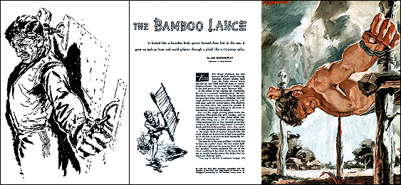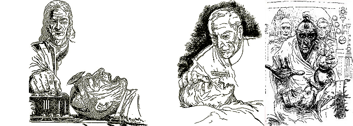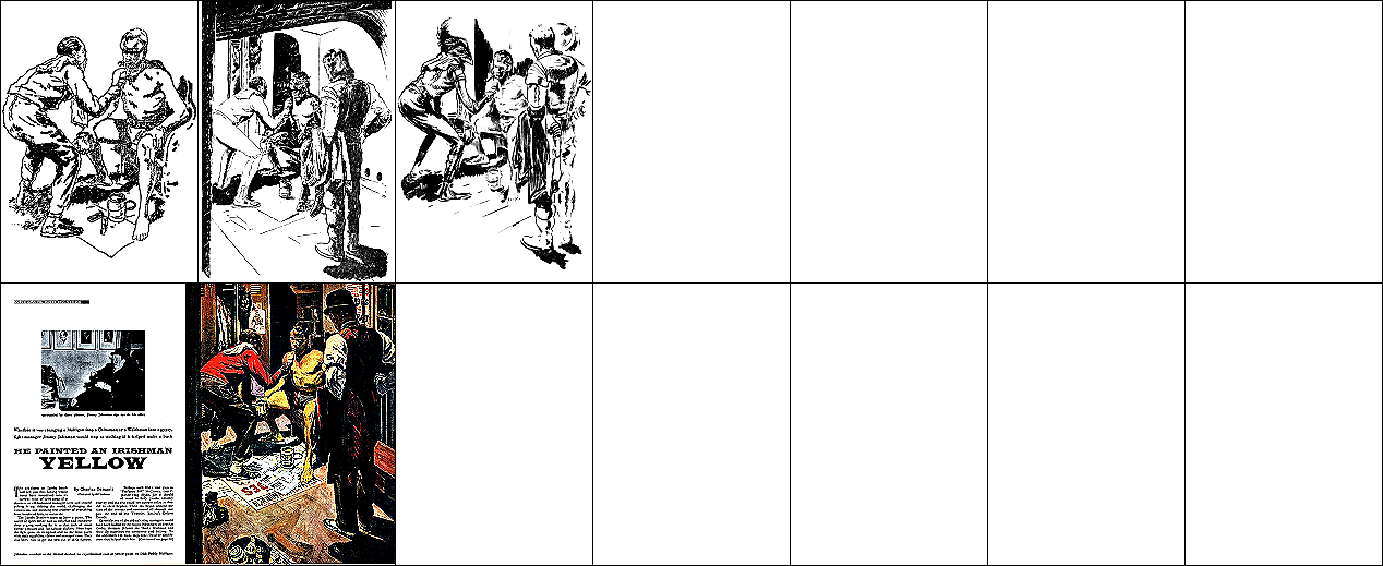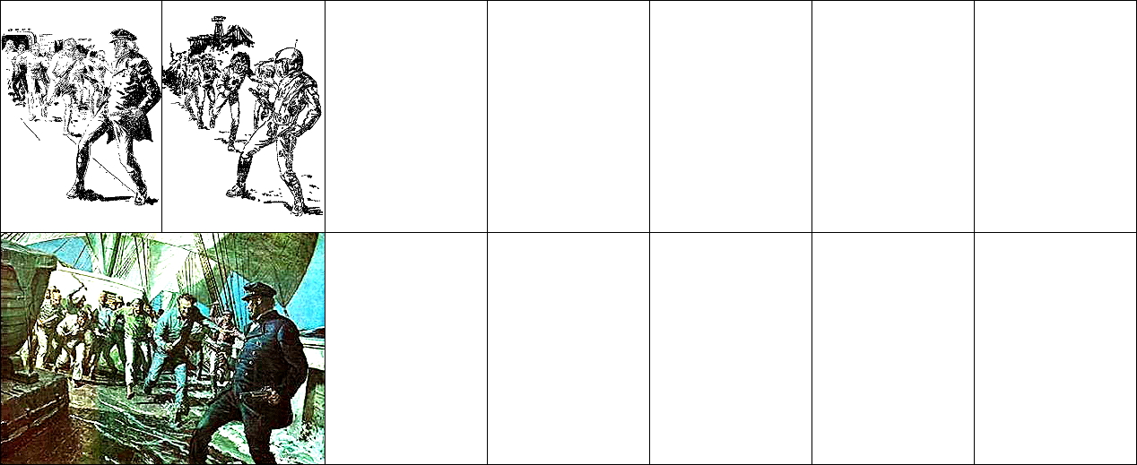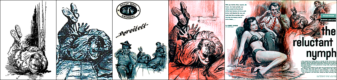 1 - 5 gleiches Bild, 5 seitenverkehrt, in 6 und 7 ist der gleiche gefesselt kauernde Mann, den man in 1 durch die Beine sieht, 8 Vorbild für die Nachzeichnung der ganzen Szene in 1 - 7 |