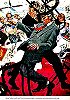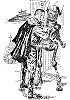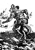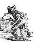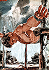 Mann mit gespreizten Beinen, durch die man am Boden kauernden Mann bzw. eine Männergruppe bzw. Bestie sieht, siehe auch
