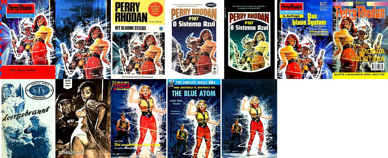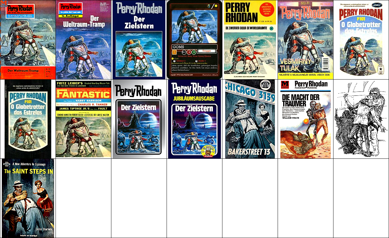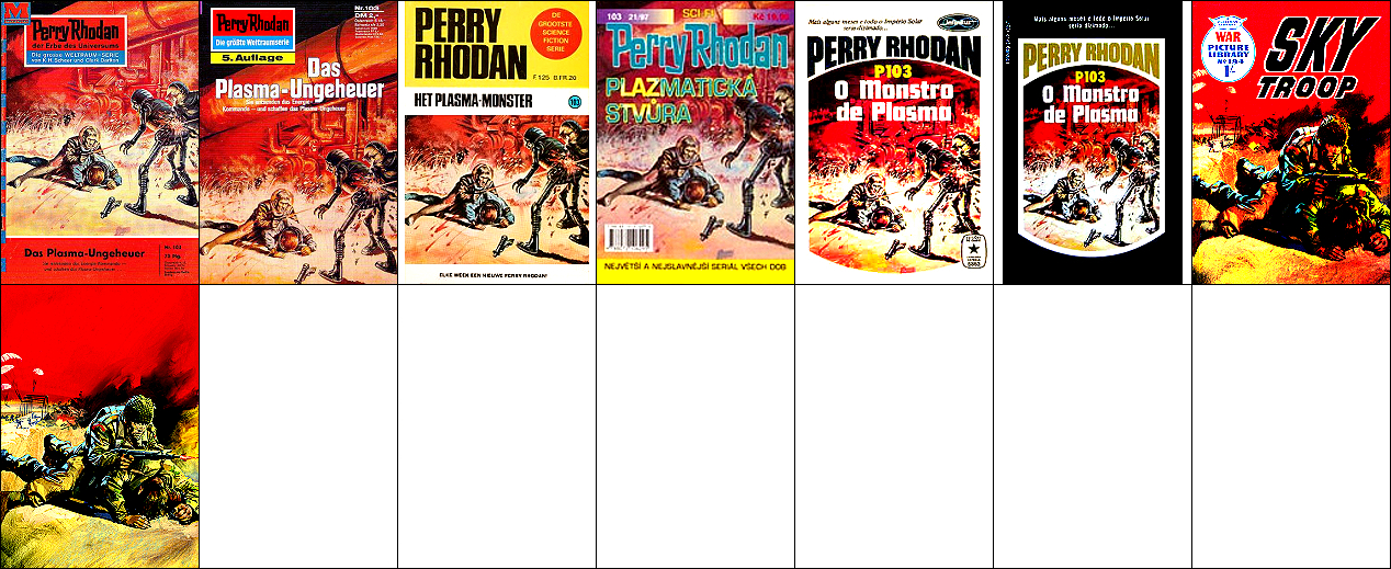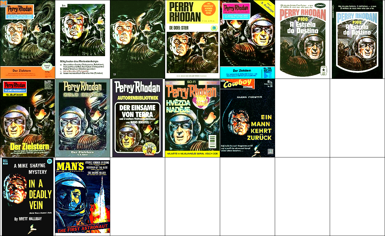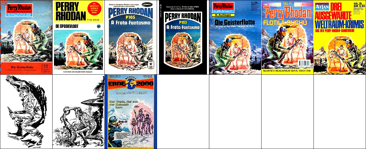 1 - 4, 5 - 11 gleiches Bild, für Neuauflage von 1 neu interpretiert, 8 - 11 seitenverkehrt, der Kopf, der das Vorbild für 1 ist, ist von 15 nachgezeichnet, 12 ist fast eine 1:1-Kopie davon, der Helm von Perry Rhodan ab der 3. Auflage ist von 16 nachgezeichnet |