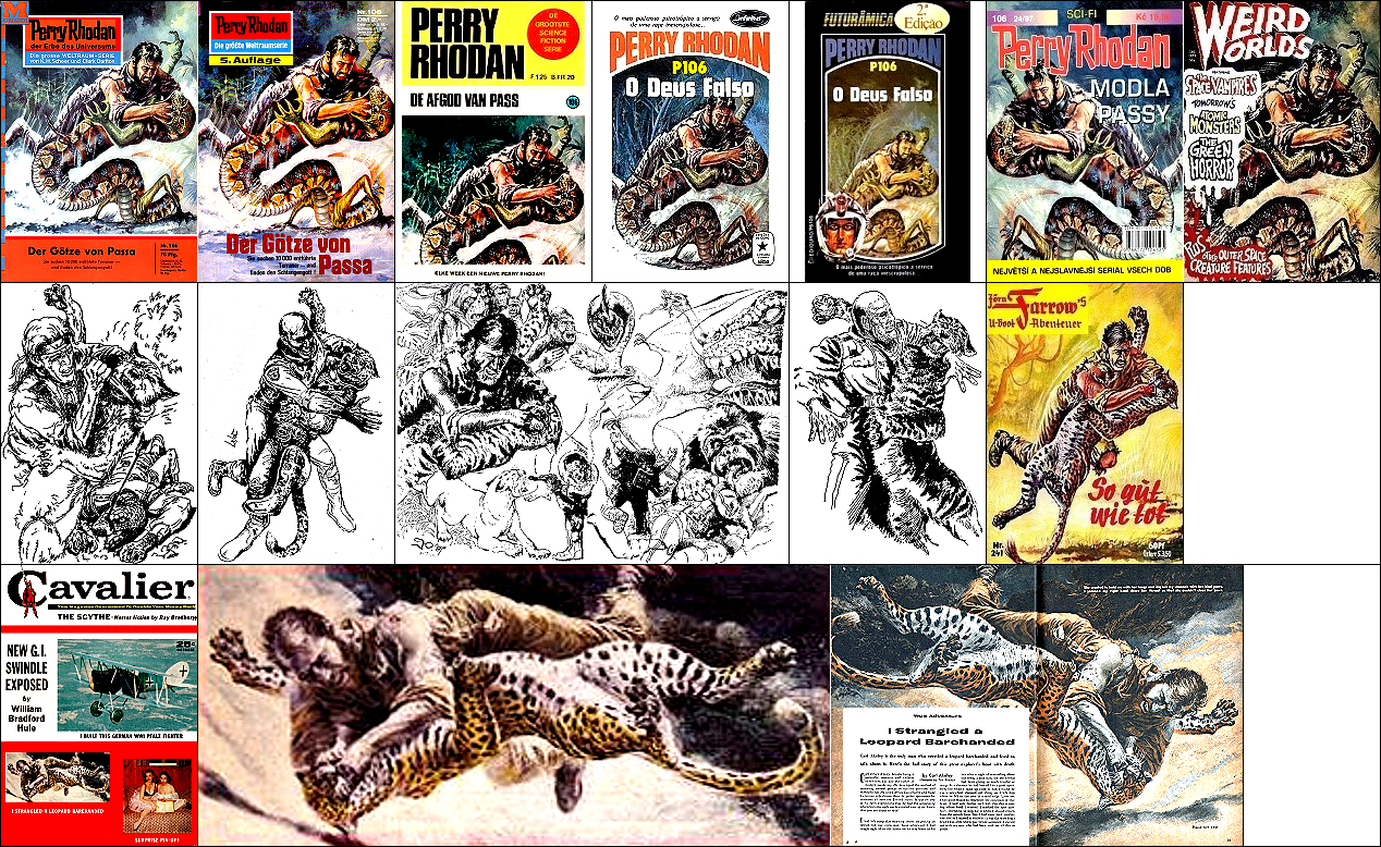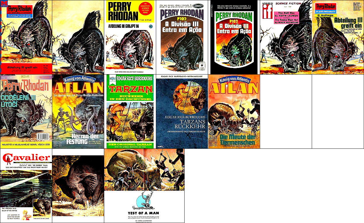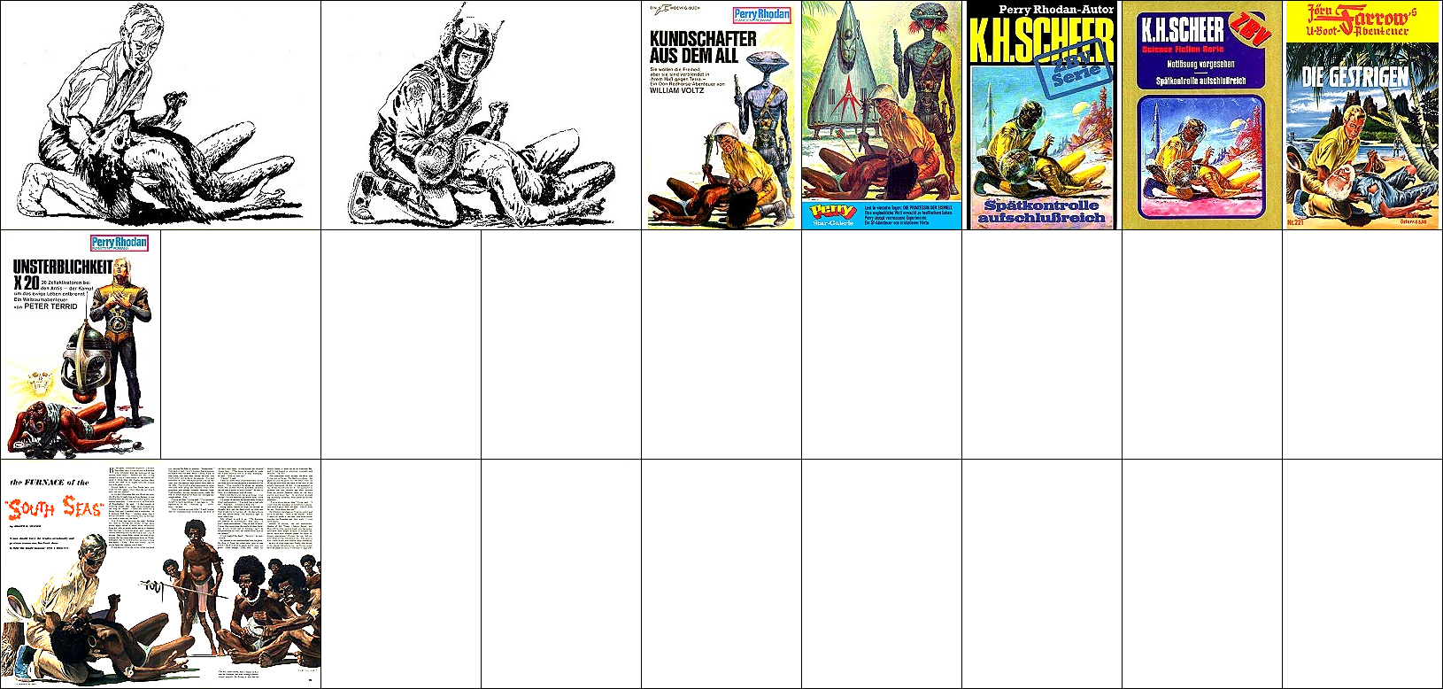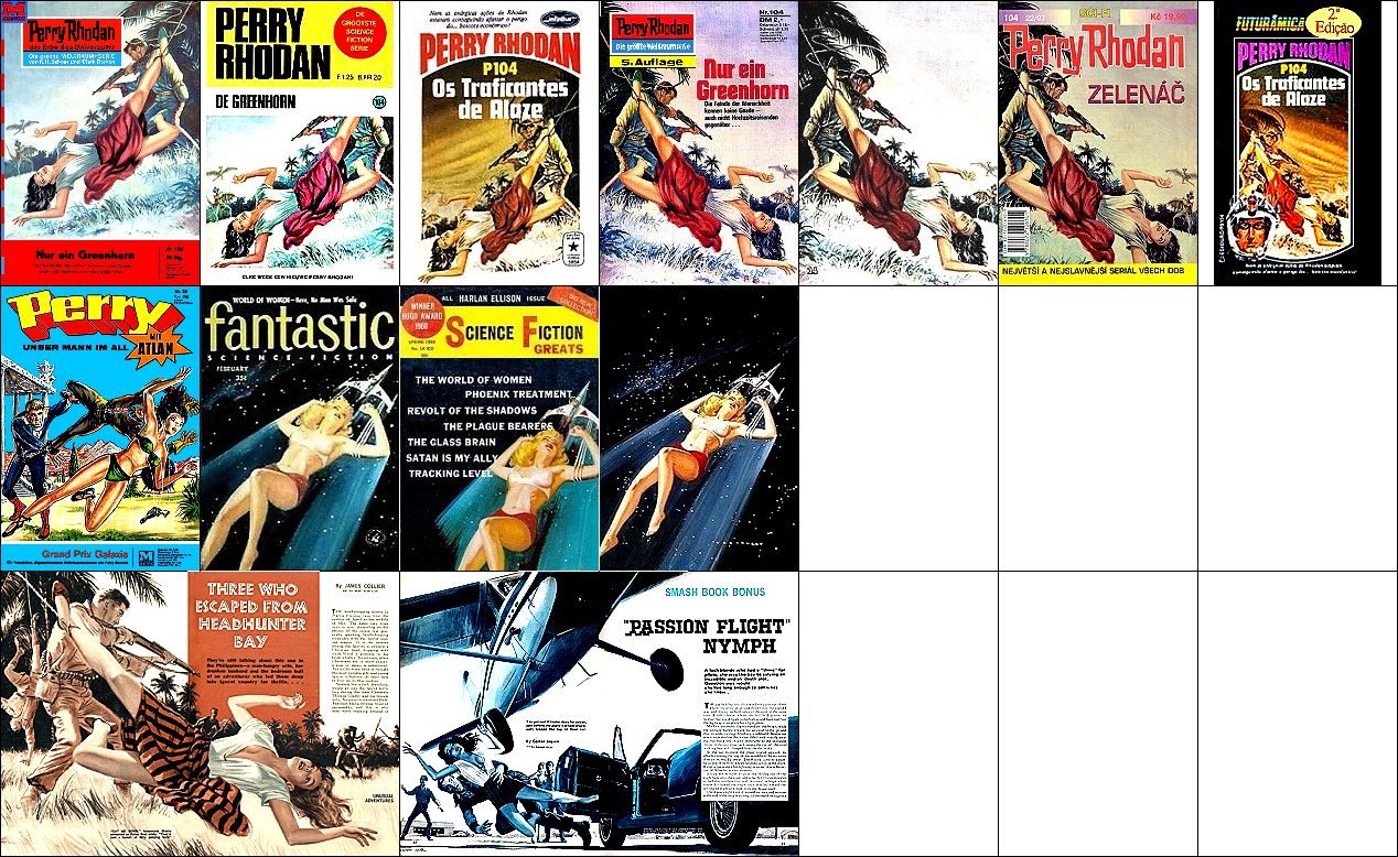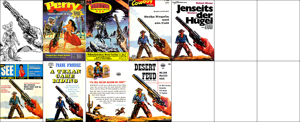 1 - 4, 5 - 11 gleiches Bild, für Neuauflage von 1 neu interpretiert, 8 - 11 seitenverkehrt, der Kopf, der das Vorbild für 1 ist, ist von 15 nachgezeichnet, 12 ist fast eine 1:1-Kopie davon, der Helm von Perry Rhodan ab der 3. Auflage ist von 16 nachgezeichnet |