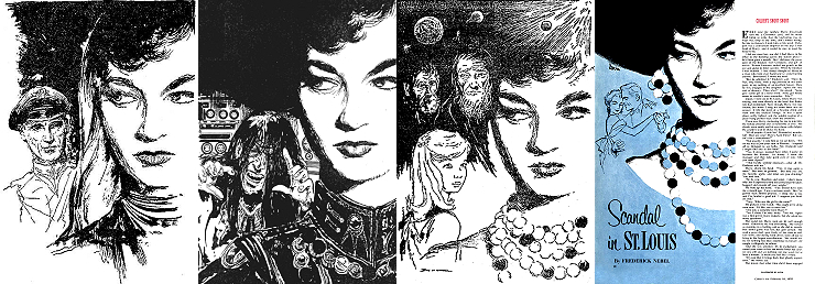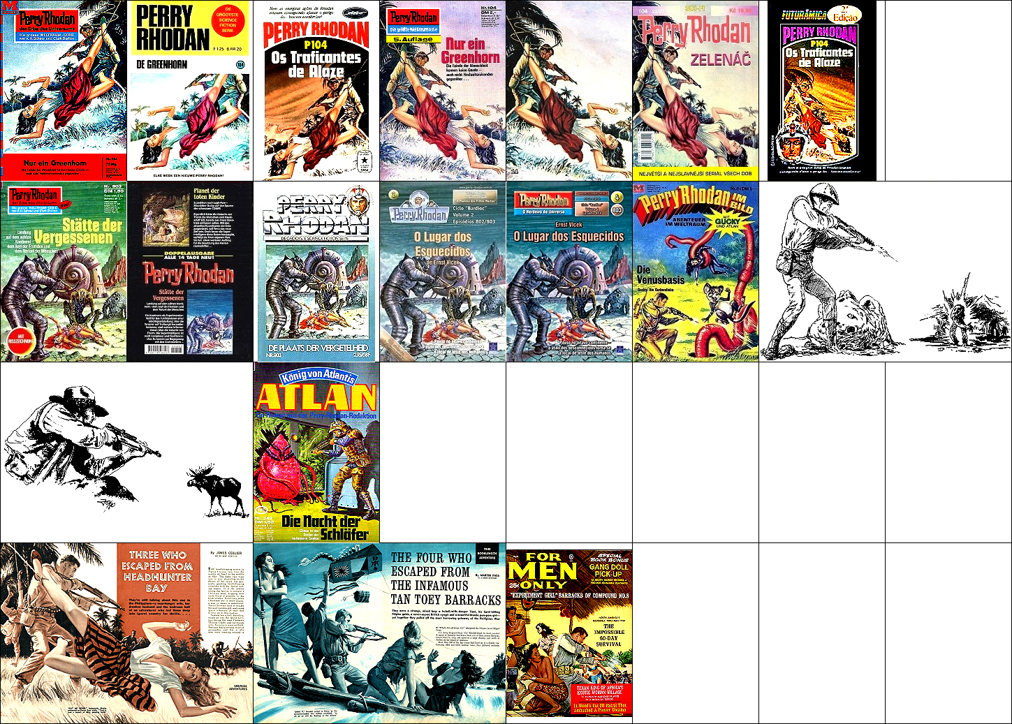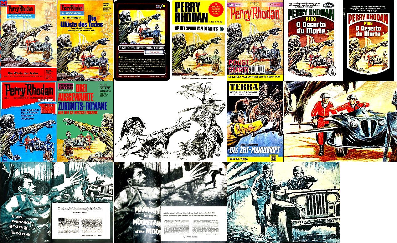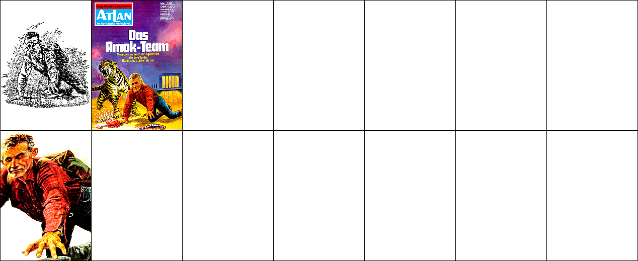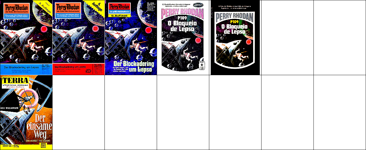 1 - 4, 5 - 11 gleiches Bild, für Neuauflage von 1 neu interpretiert, 8 - 11 seitenverkehrt, der Kopf, der das Vorbild für 1 ist, ist von 15 nachgezeichnet, 12 ist fast eine 1:1-Kopie davon, der Helm von Perry Rhodan ab der 3. Auflage ist von 16 nachgezeichnet |