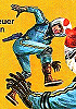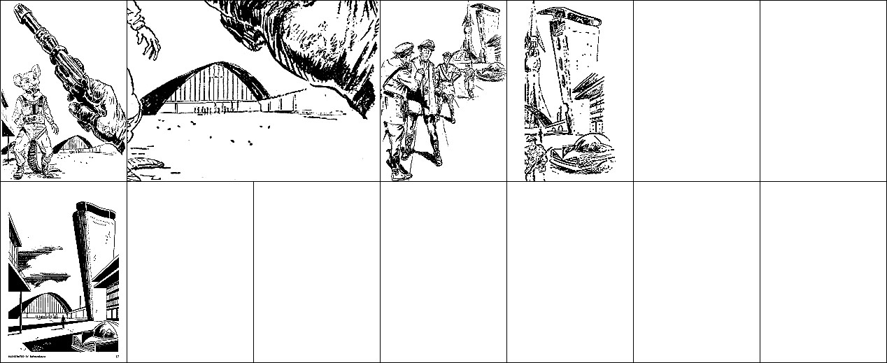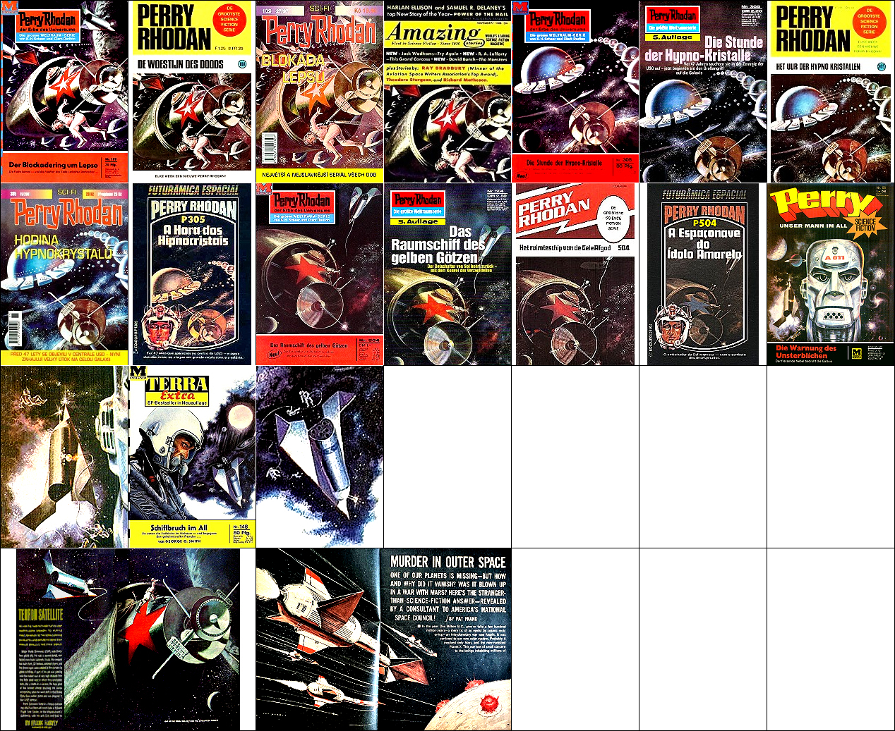ähnliches Motiv, 1 - 4, 5 - 9, 10 - 13 gleiches Bild, 13 leicht nachbearbeitet (Stern blau statt rot); in 14 und 16 findet sich das kleine Raumschiff mit den geknickten Deltaflügeln wieder, die Szene ist von 22 nachgezeichnet bzw. übernommen, das Raketenraumschiff in 1 links unter dem Titellogo ist von 23 nachgezeichnet |
