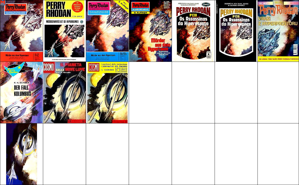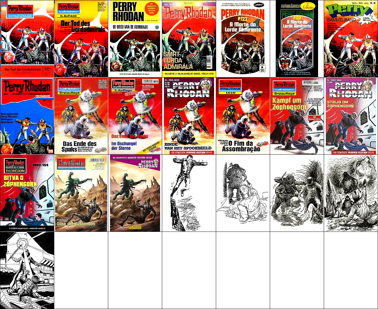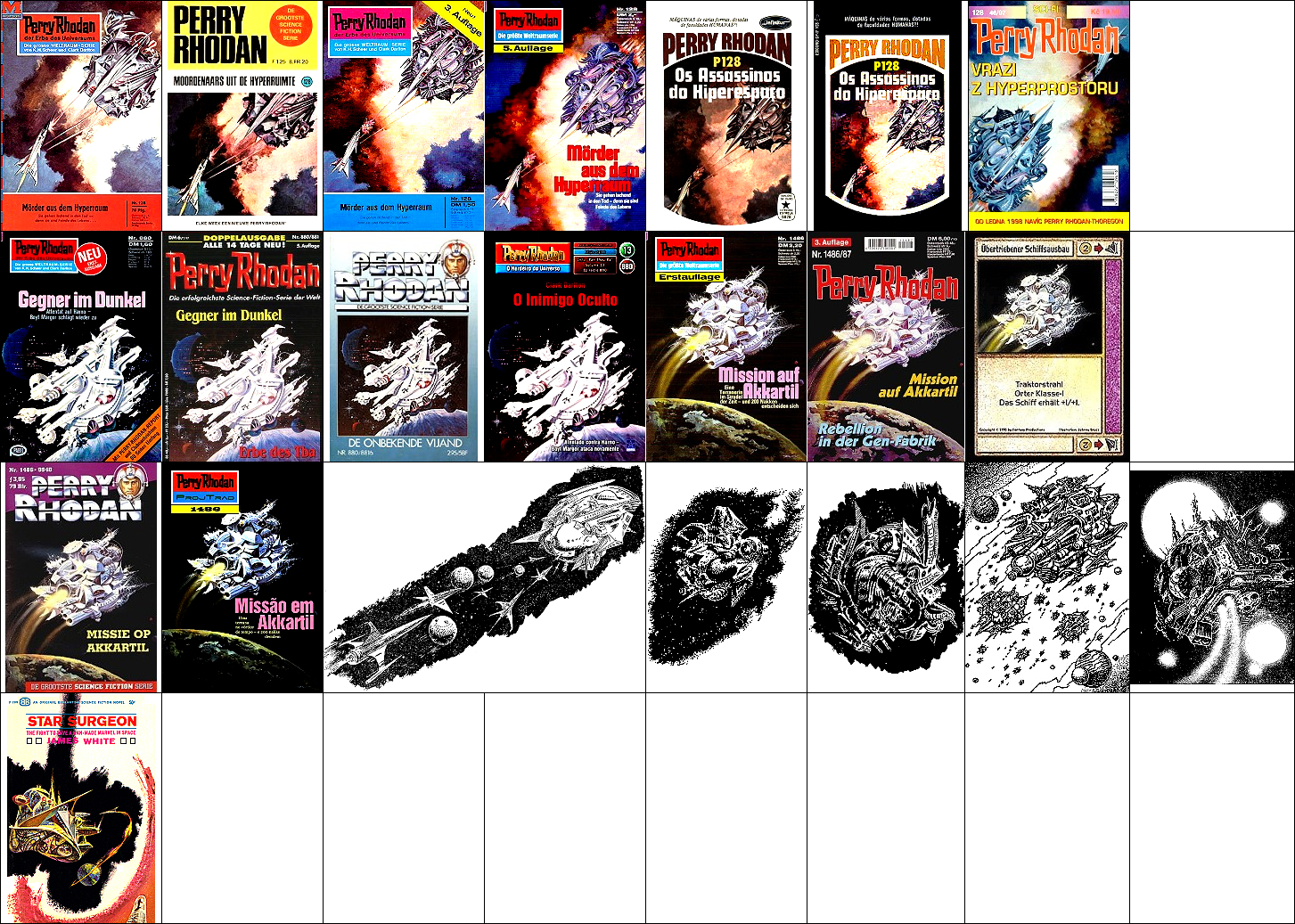 ähnliches Motiv, 1 - 2, 3 - 7 gleiches Bild, Neuzeichnung von 1 für Neuauflage, 7 umgedreht, 8 - 11, 12 - 16 gleiches Bild, das Raumschiff in 1 könnte von 22 inspiriert sein |