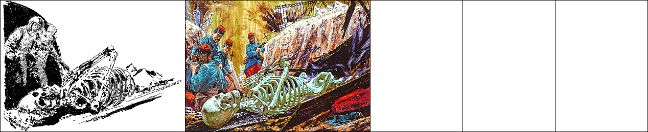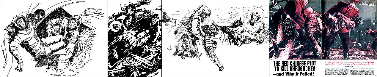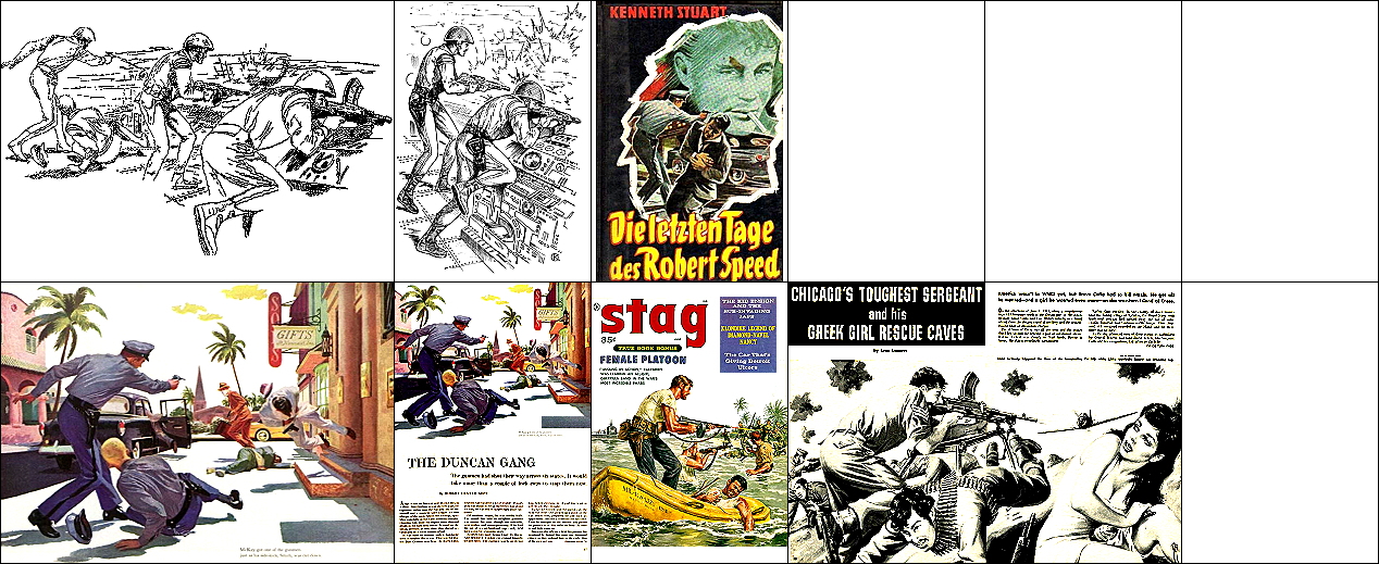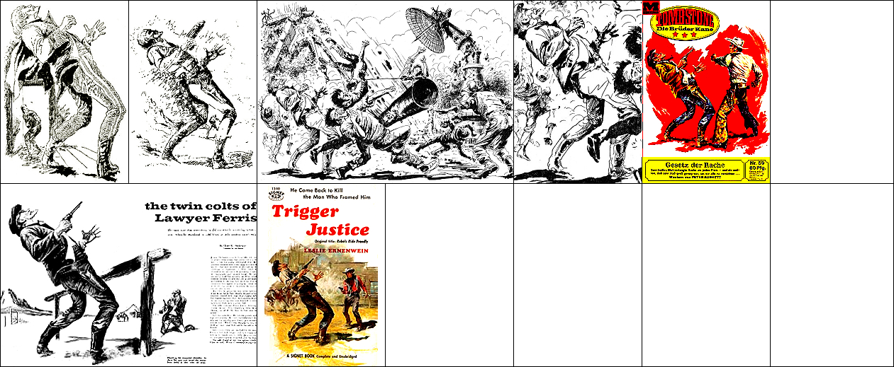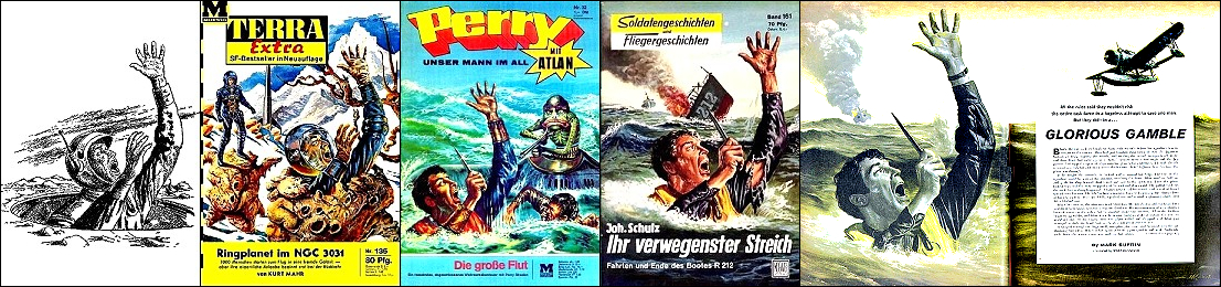 1 - 8 gleiches Bild, ab 3 leicht bearbeitet (Explosionsflammen vergrößert), 6 - 8 seitenverkehrt, 9 gleiches Gesicht, 10 -11 gleiches Bild, Nachzeichnung von 1 für HC-Ausgabe mit verändertem Gesicht, 15 - 16 Vorbild für Nachzeichnung des Mannes in 1, wobei es sich um den Schauspieler John Wayne handelt;137 - 18 gleiches Bild,Vorbild für Rakete und Explosionsflammen in 1. |