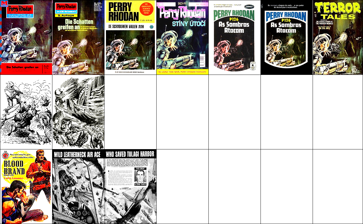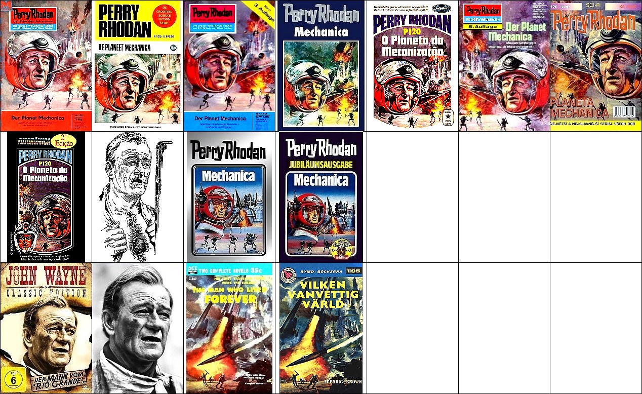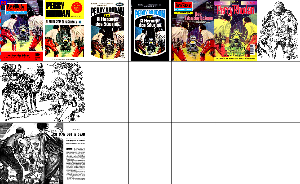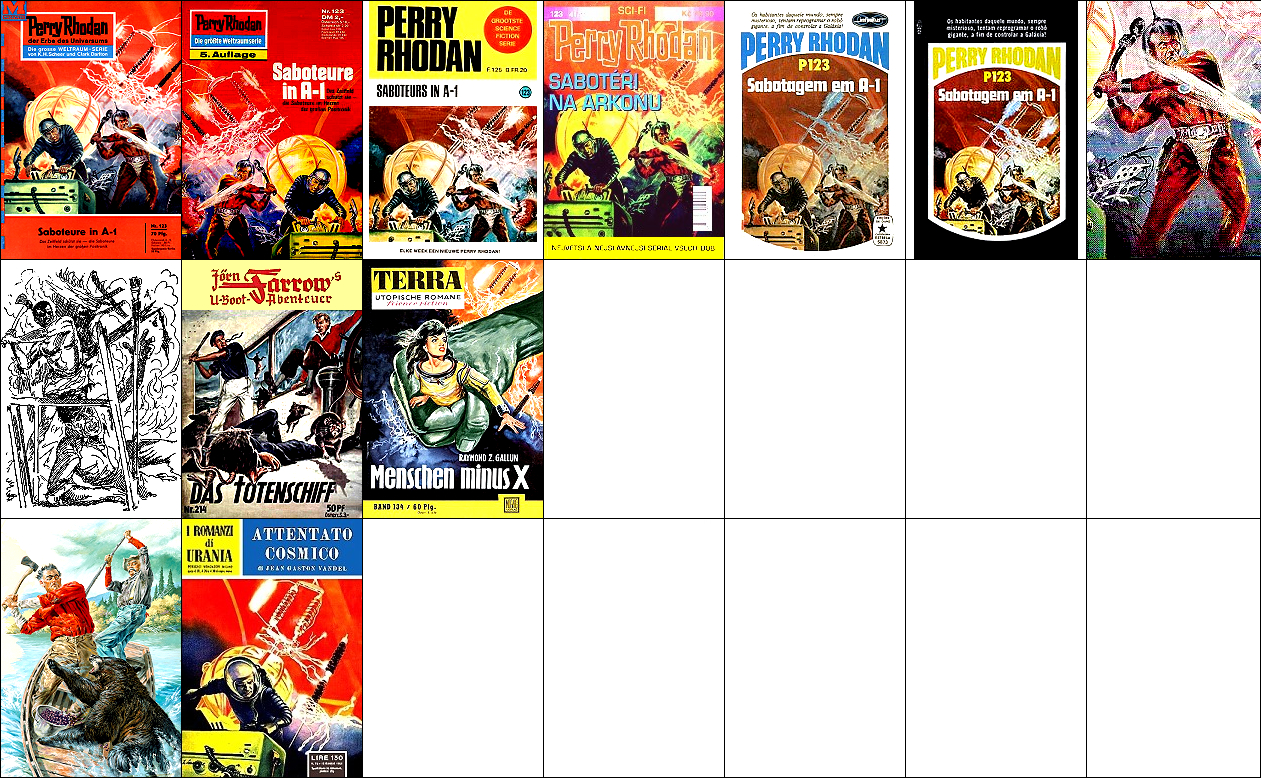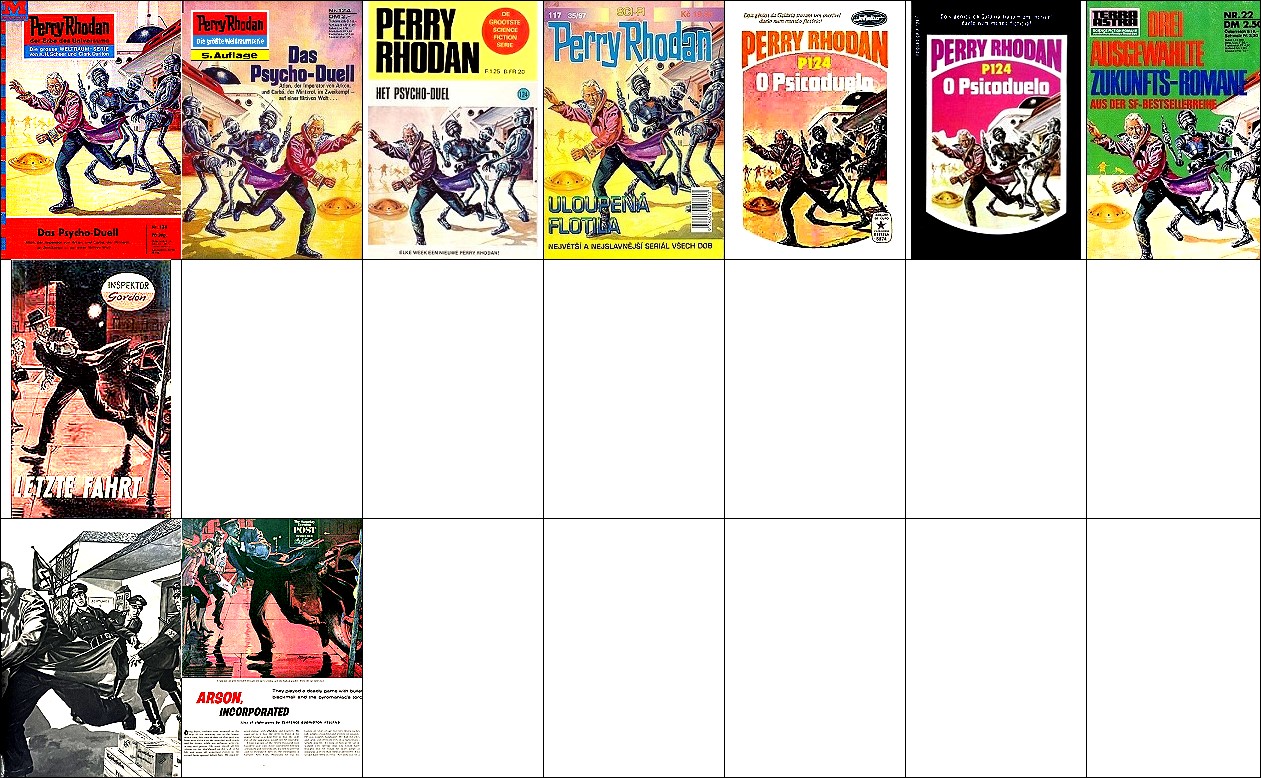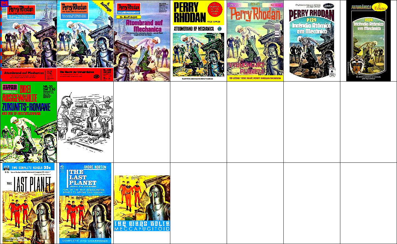 sehr ähnliches Motiv, 1 - 8 gleiches Bild, 3 und 7 seitenverkehrt, 8 mit überarbeitetem Hintergrund. Das Bild wurde in der 4. Auflage für den falschen Roman verwendet. 9 ähnlicher Roboter, 15 - 17 gleiches Bild, Roboter in 1 und 9 davon nachgezeichnet. |